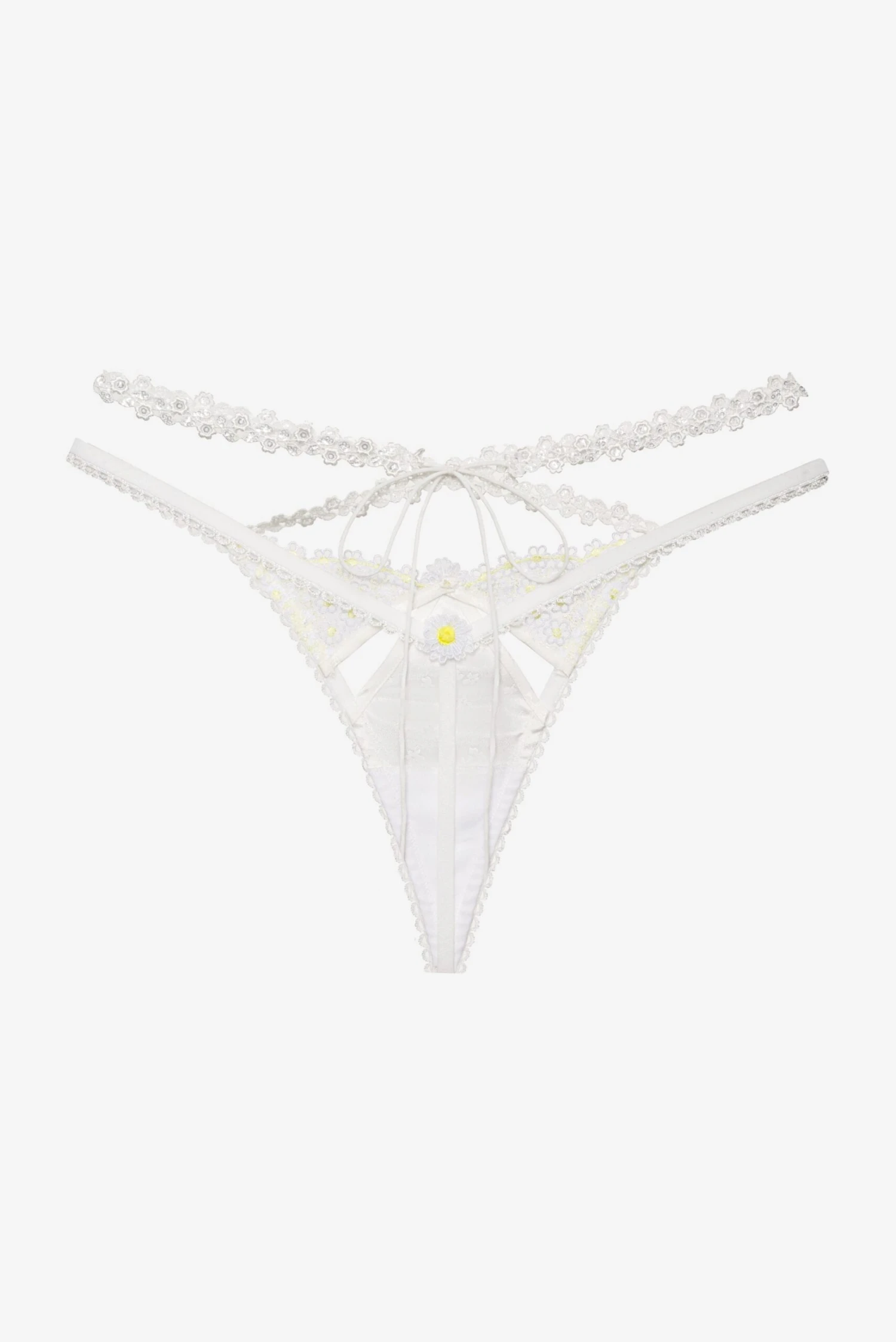 Fresh as a daisy, this flower-adorned piece makes a statement with decorative floral trim crisscrossed at the waist, cutout details, and dimensional blooms.