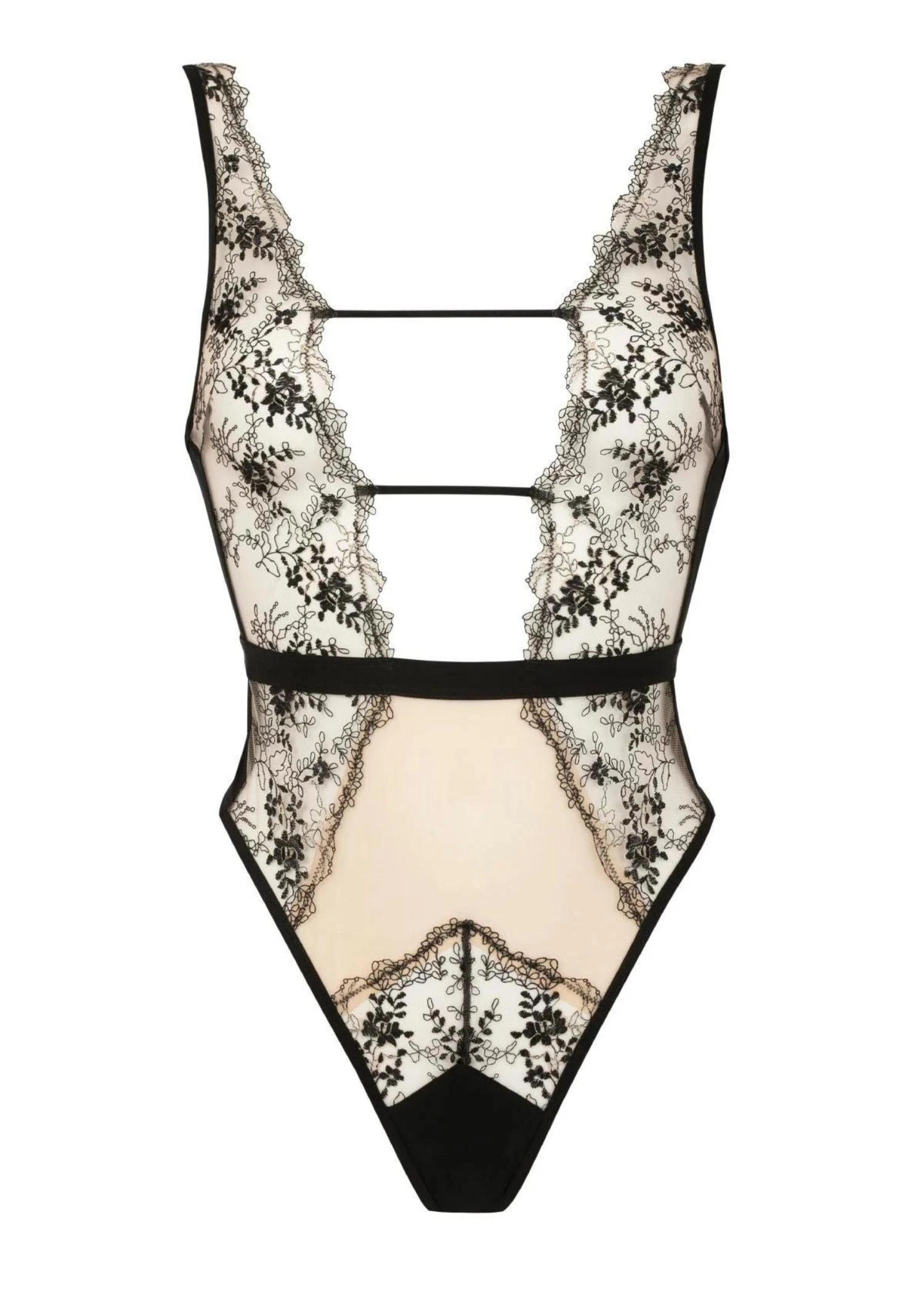 This gorgeous bodysuit by Atelier Amour features a plunging neckline, with black floral embroidery on soft nude tulle. The smooth satin hugs the waist area to accentuate your curves for an alluring look.