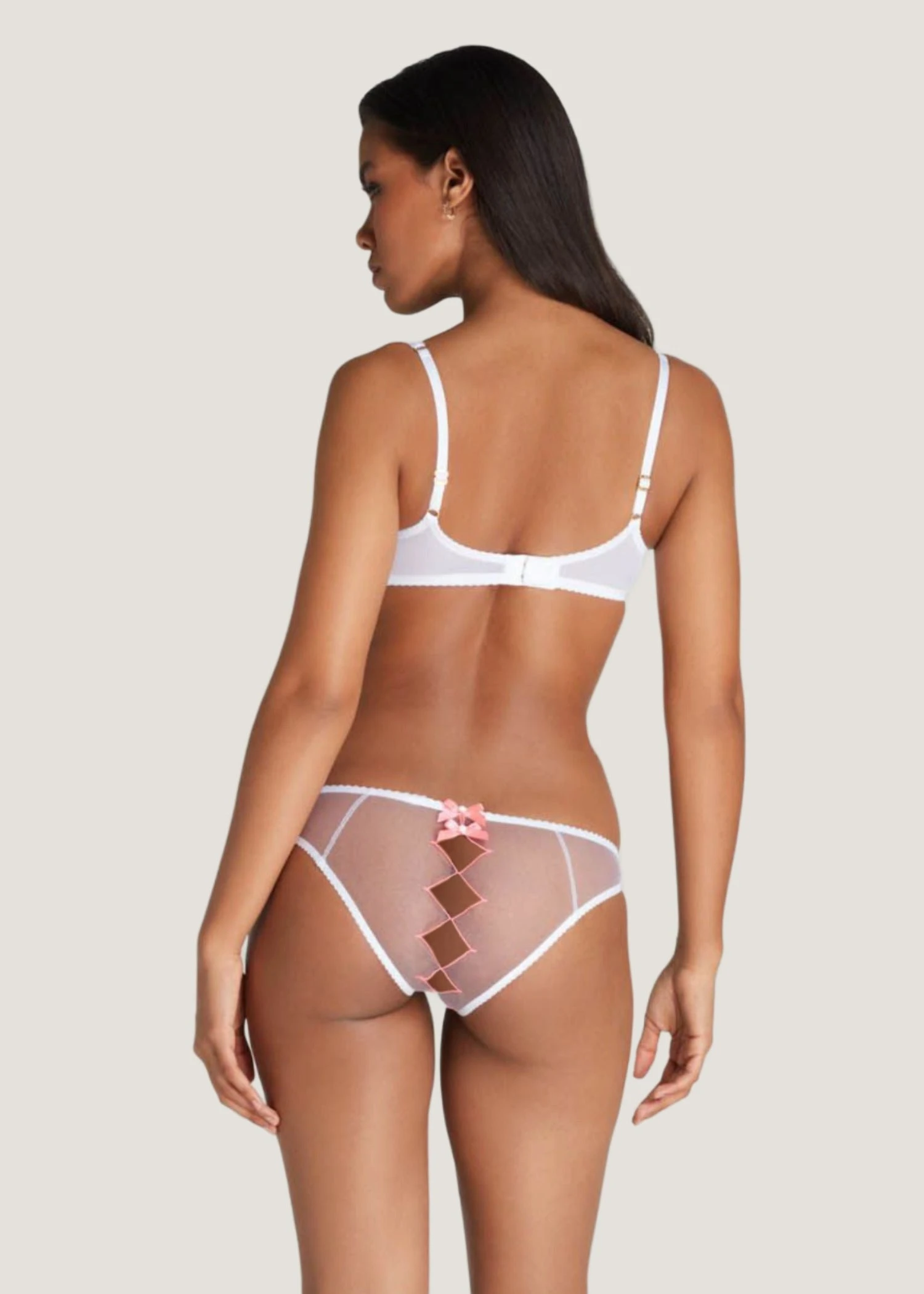 Transform your boudoir with the exquisite Lorna Ouvert. Crafted from whisper-soft sheer tulle and edged with graceful swooping scallops bound in pink Swiss embroidery, this mesmerizing ethereal piece is the perfect combination of beauty and naughty glamour. Revel in its luxurious French seam details for the ultimate in day or night indulgence. Dare to dream!