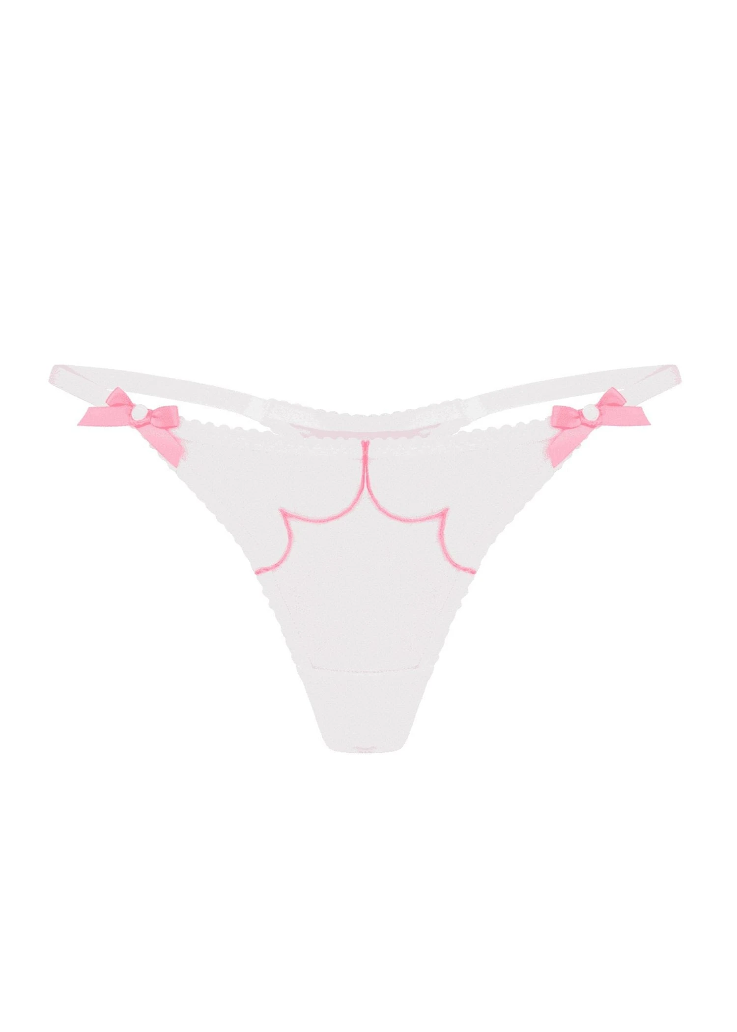 Discover breathtaking elegance in our iconic Lorna thong. A dreamy combination of whisper-soft sheer tulle edged in graceful scallops finished with pink Swiss embroidery and luxurious French seam detailing, this ethereal design is perfect for day or night. Make a lasting impression and let your beauty shine!