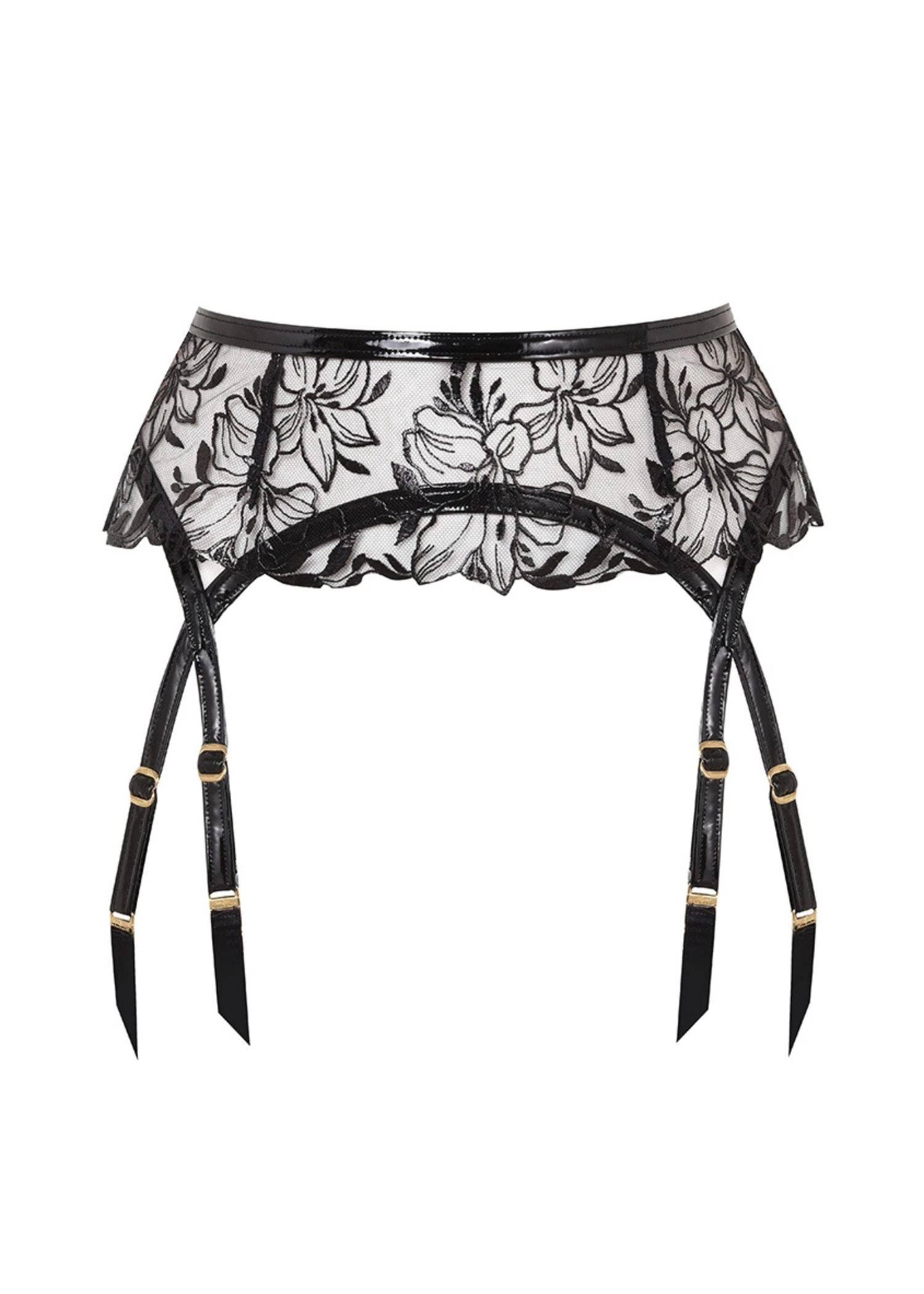Featuring sensual floral embroidery on sheer black tulle, and foiled wetlook finish double straps. This feminine and fierce suspender is the perfect piece to add a little sass to your Ozella collection.