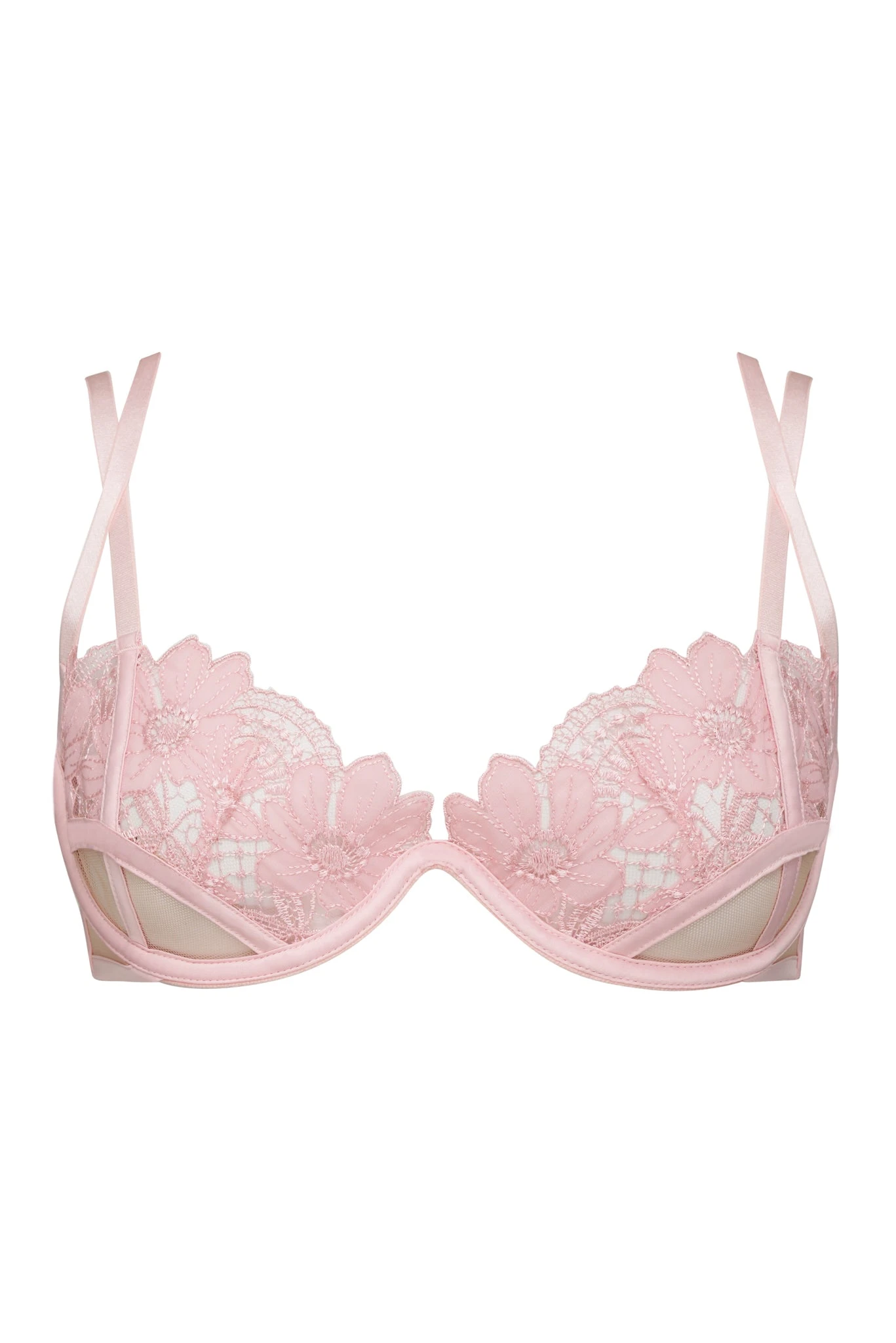 Bold blooms decorate this daring design, featuring strappy accents and peekaboo cutouts on the cups.