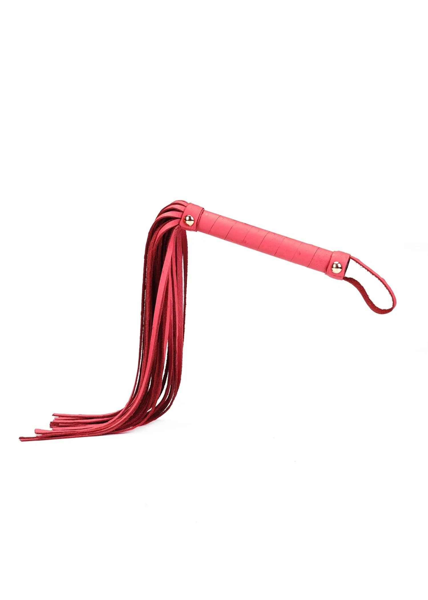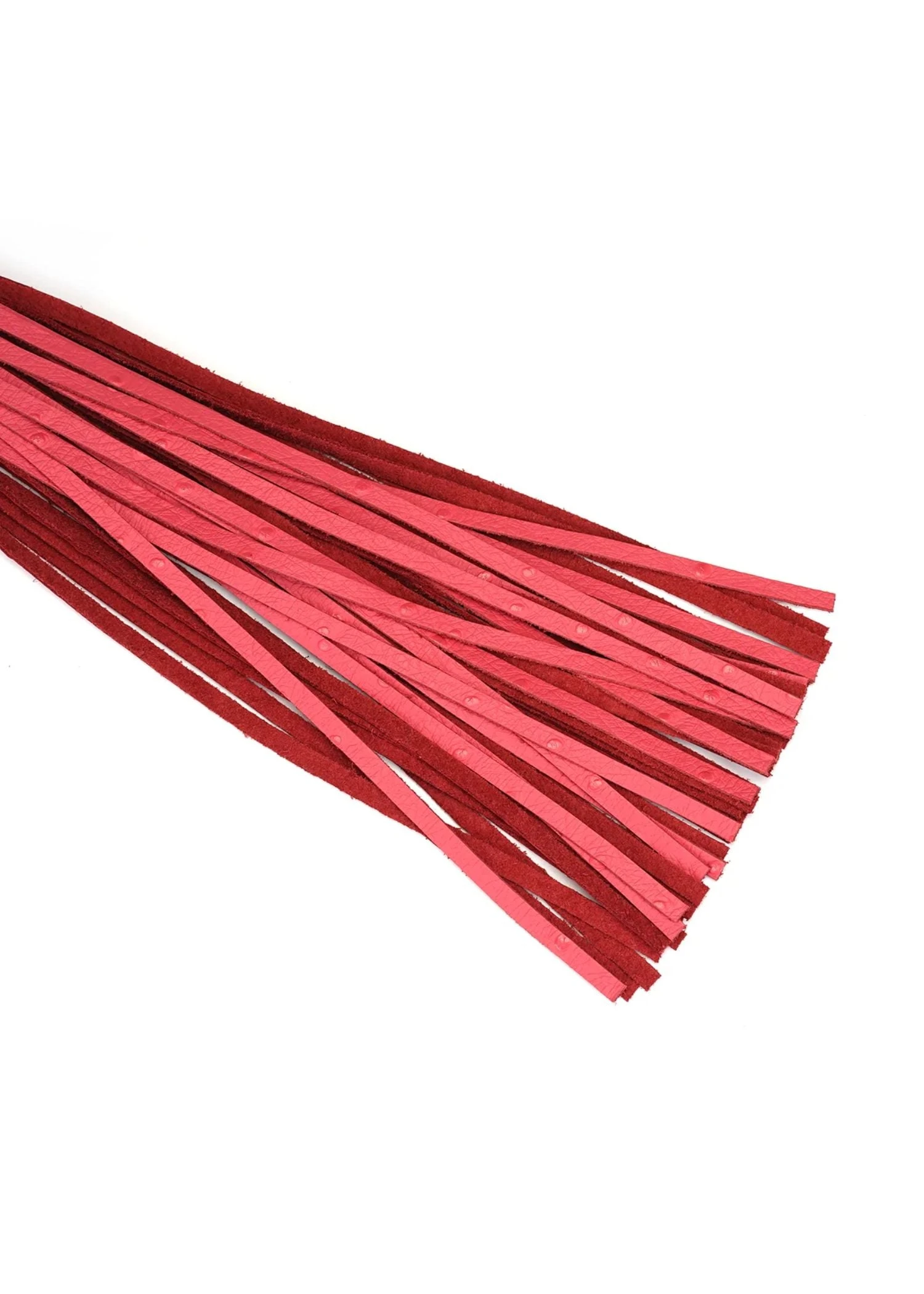 Add a pop of color to your BDSM collection with this neon pink Angel’s Kiss leather flogger whip. This small flogger whip is a great introduction to impact play. The lightweight and flexibility offers easy swings while the Ostrich skin pattern on the leather handle lends to a secure grip.