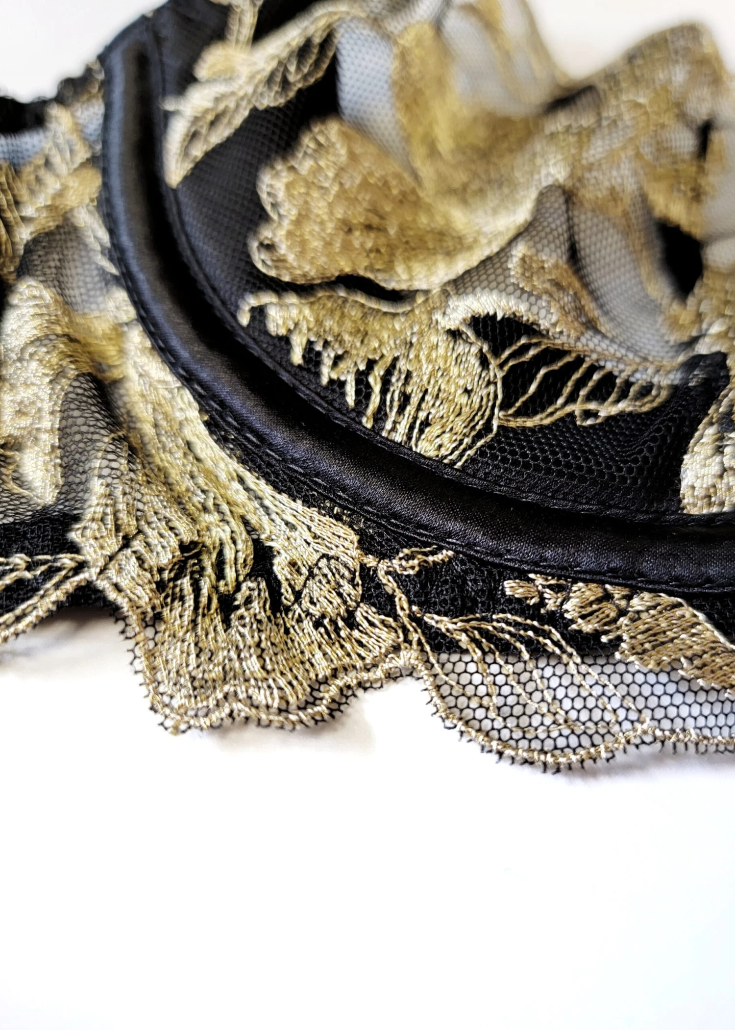 Show off your best assets in the ethereal Aria. Playing with shimmering textures of black tulle and gold botanical embroidery on silk quarter cups that provide total support.