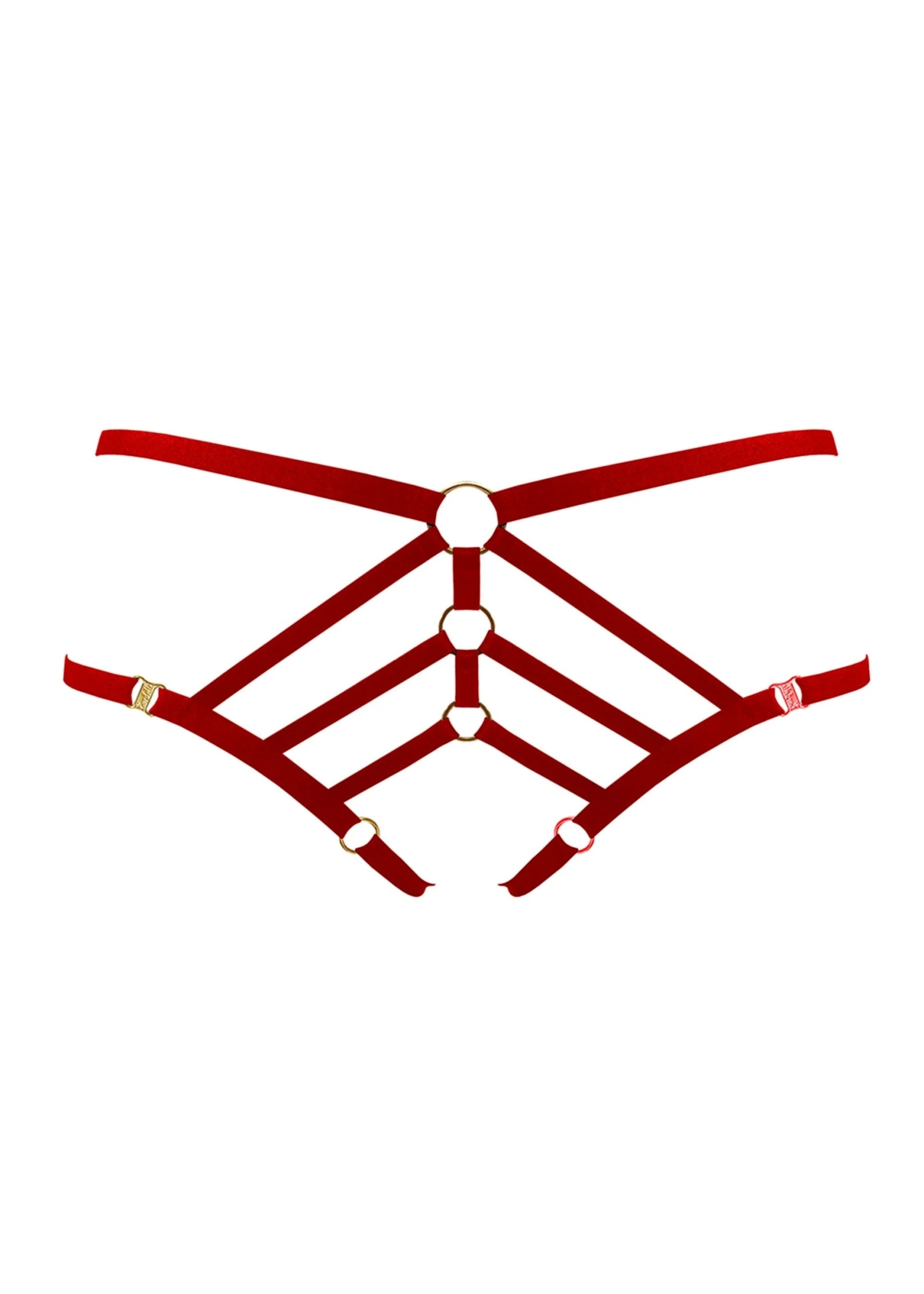 Defined by the clean lines and geometric multi-strap design, the Art Deco Ouvert Strap Brief is handcrafted from lustrous soft elastic strapping which accentuates your curves. Finished with 24K gold plated hardware, this dynamic and daring piece in red conceals yet reveals. Wear with the matching bra and suspender to rock the ultimate boudoir look.