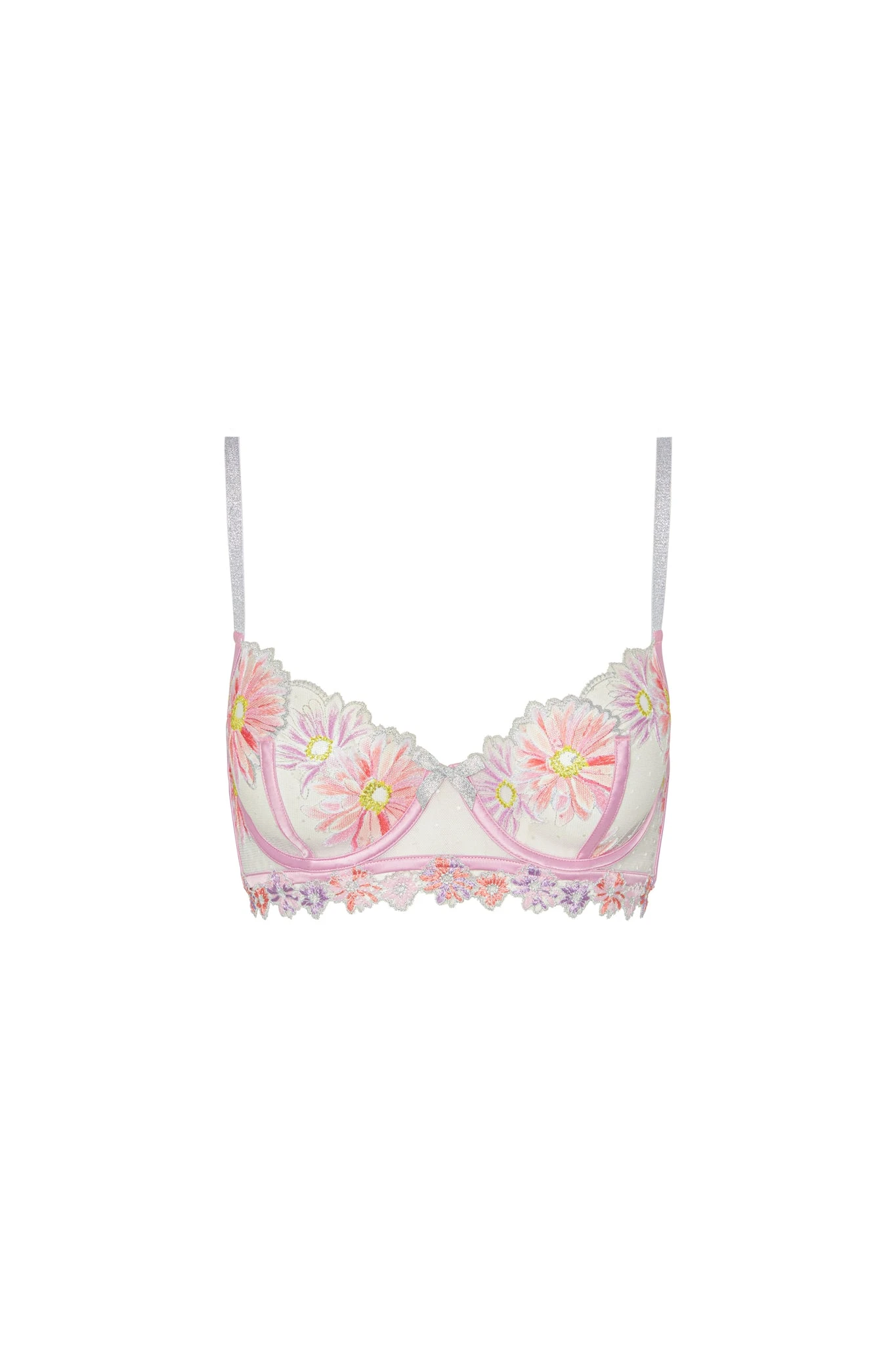 Pretty in petals. This charming balconette style is blooming with pink daisy embroidery that elevates your mood. The scalloped cups and floral trim add a delicate touch. Kissed with metallic bows in front and back.