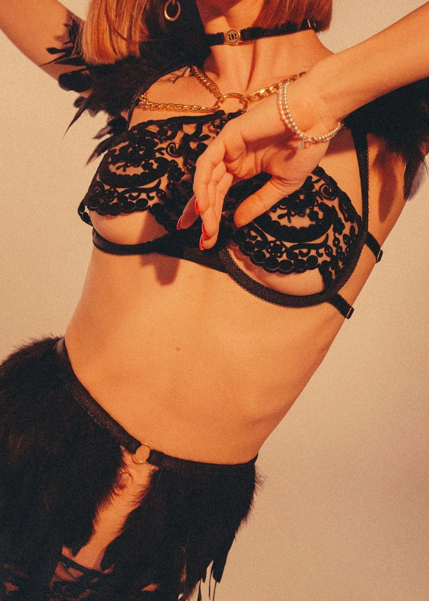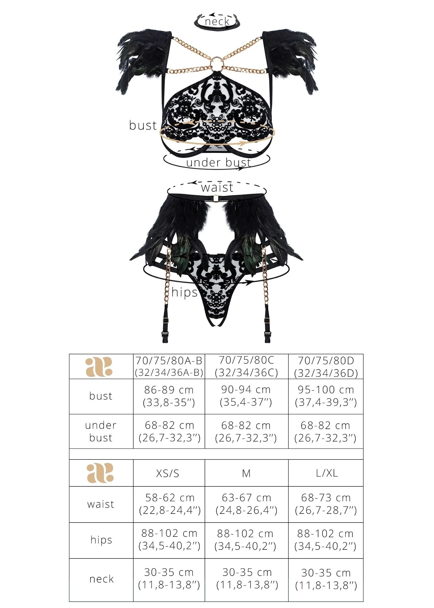 When innocence meets sinful sentiments. Featuring tender black feathers that caresses the body, embellished by gold chains depicting the contradiction between an angel and a devil.