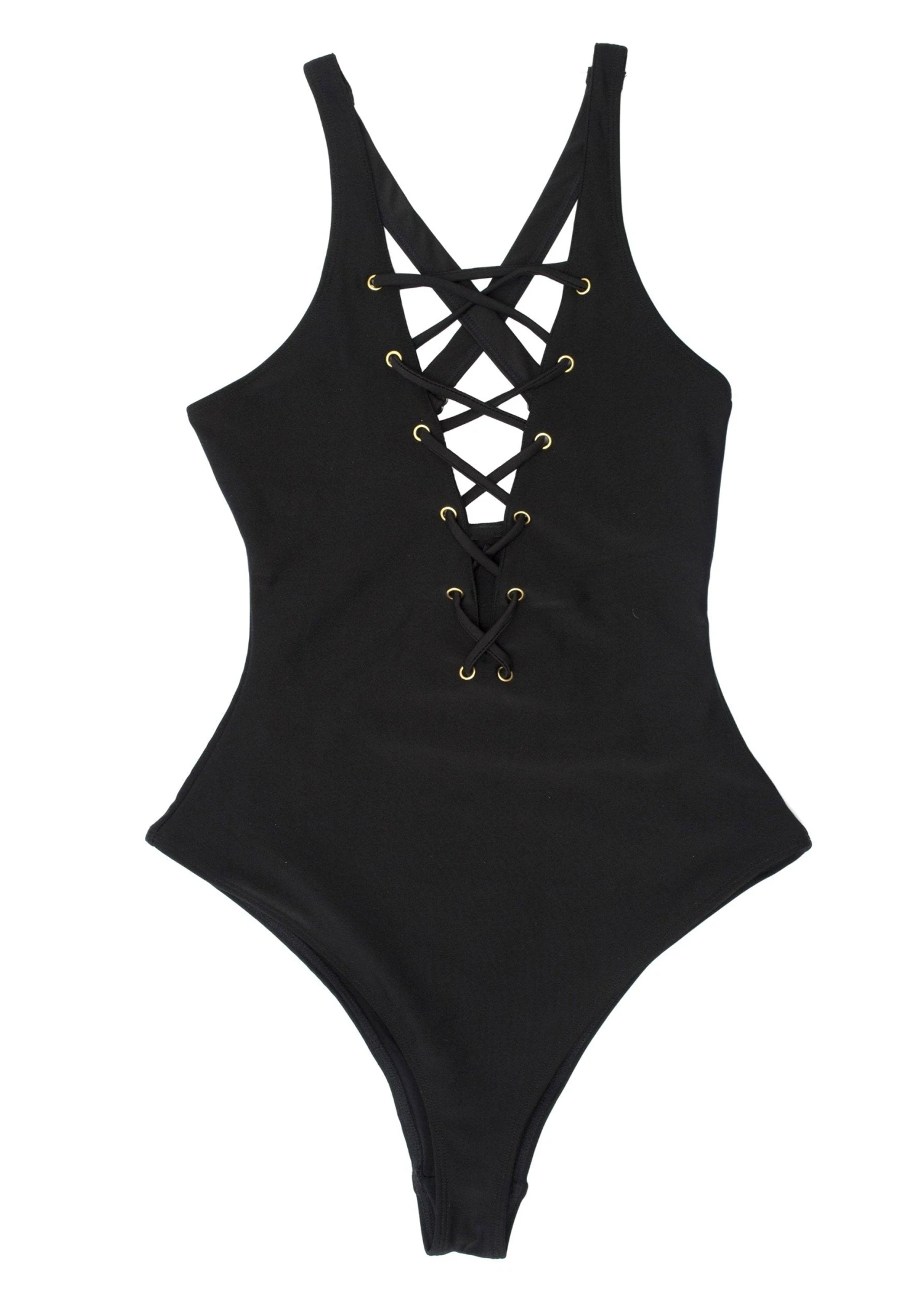 Featuring a low cut V-front with lace up design and a cross-back design at the back, the Blake Black Lace Up Front Swimsuit provides additional support with lined mesh cups.