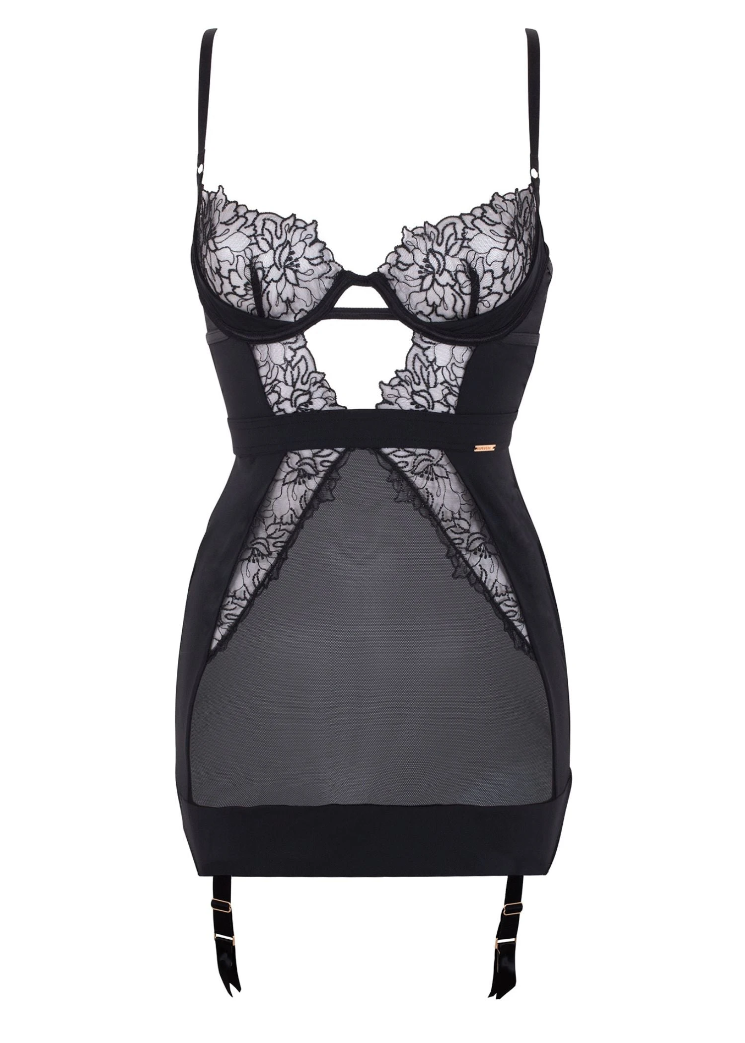 The Alanna Longline Basque is a feminine take on lingerie with its daring design, intricate lace, and delicate sheer mesh. It’s cut to give the wearer a flattering silhouette while still maintaining a sultry allure. This longline basque is sure to up your seductive game. It’s perfect for wearing with the Alanna Thong for a sultry look.