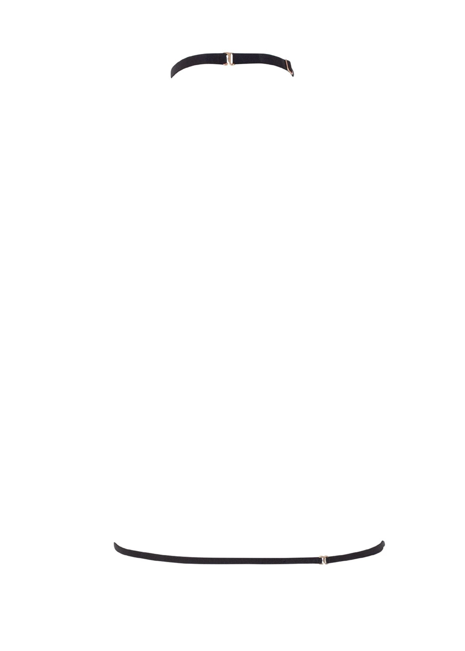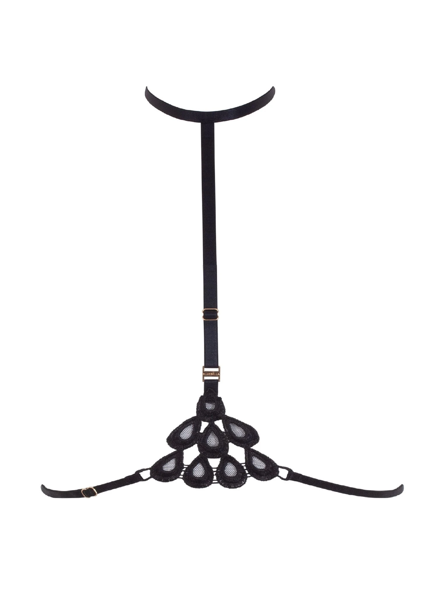 The Aria harness is the perfect finishing touch to your daring lingerie ensemble. Spotlighting chic lace and gold-tone hardware for an opulent accent, this minimalist piece flatters your figure with its dainty, directional straps. Pair it with the rest of the Aria collection to complete the look.