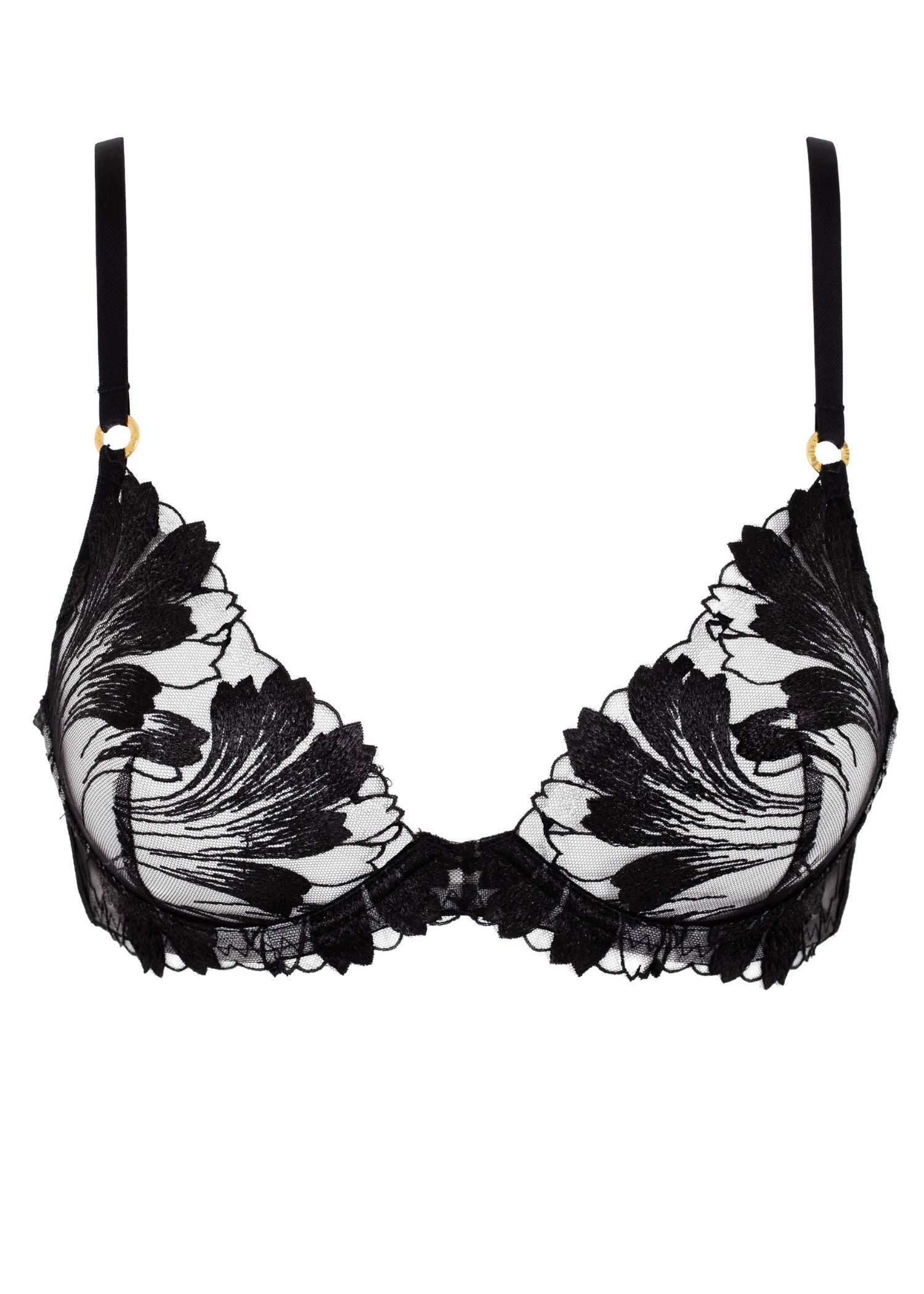 Inspired by botanical elements, the Colette Bra brings a contemporary take on elegant lingerie. Intricate floral embroidery placed on seductive sheer mesh, elevated with embroidered back straps and gold-tone hardware.