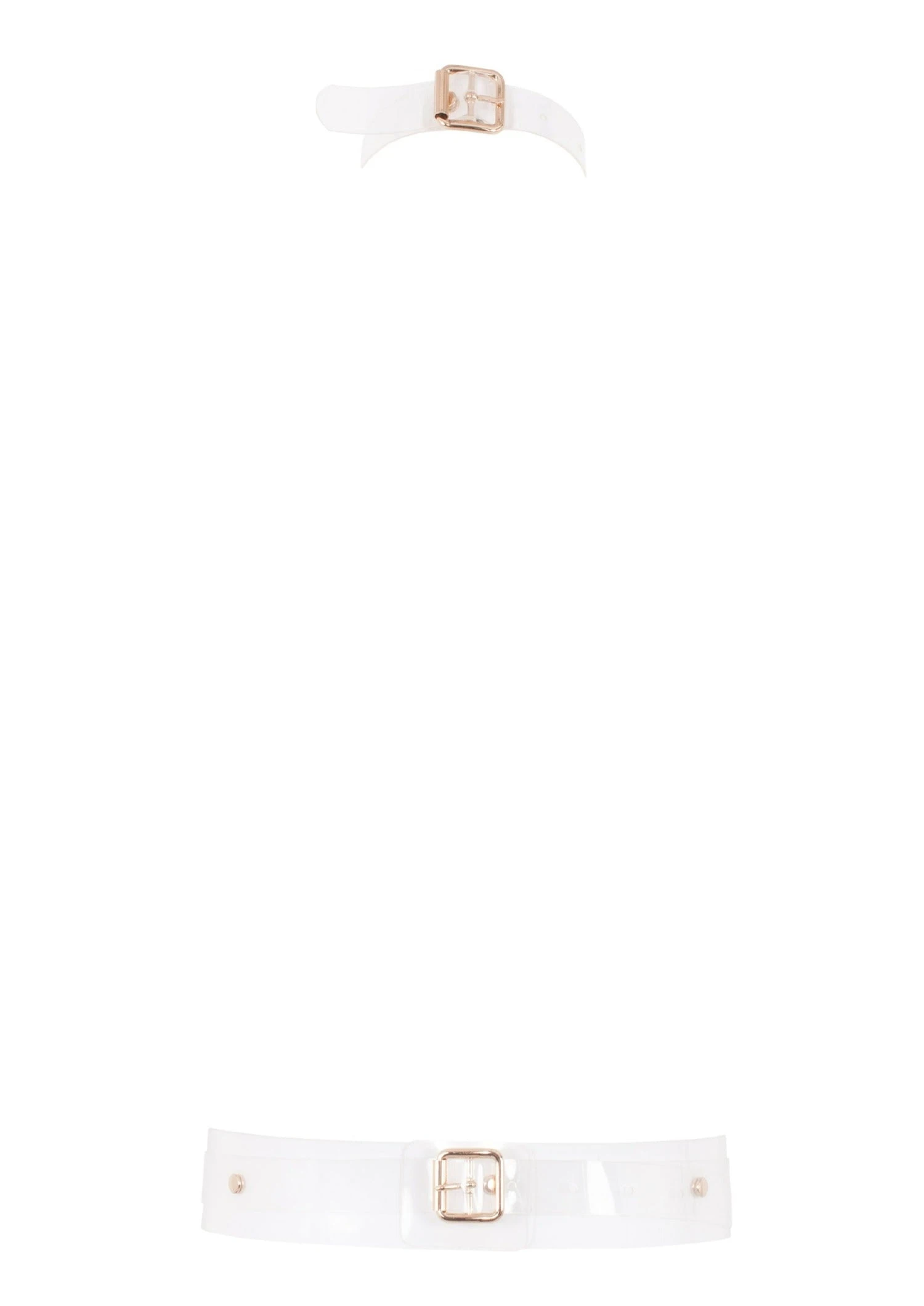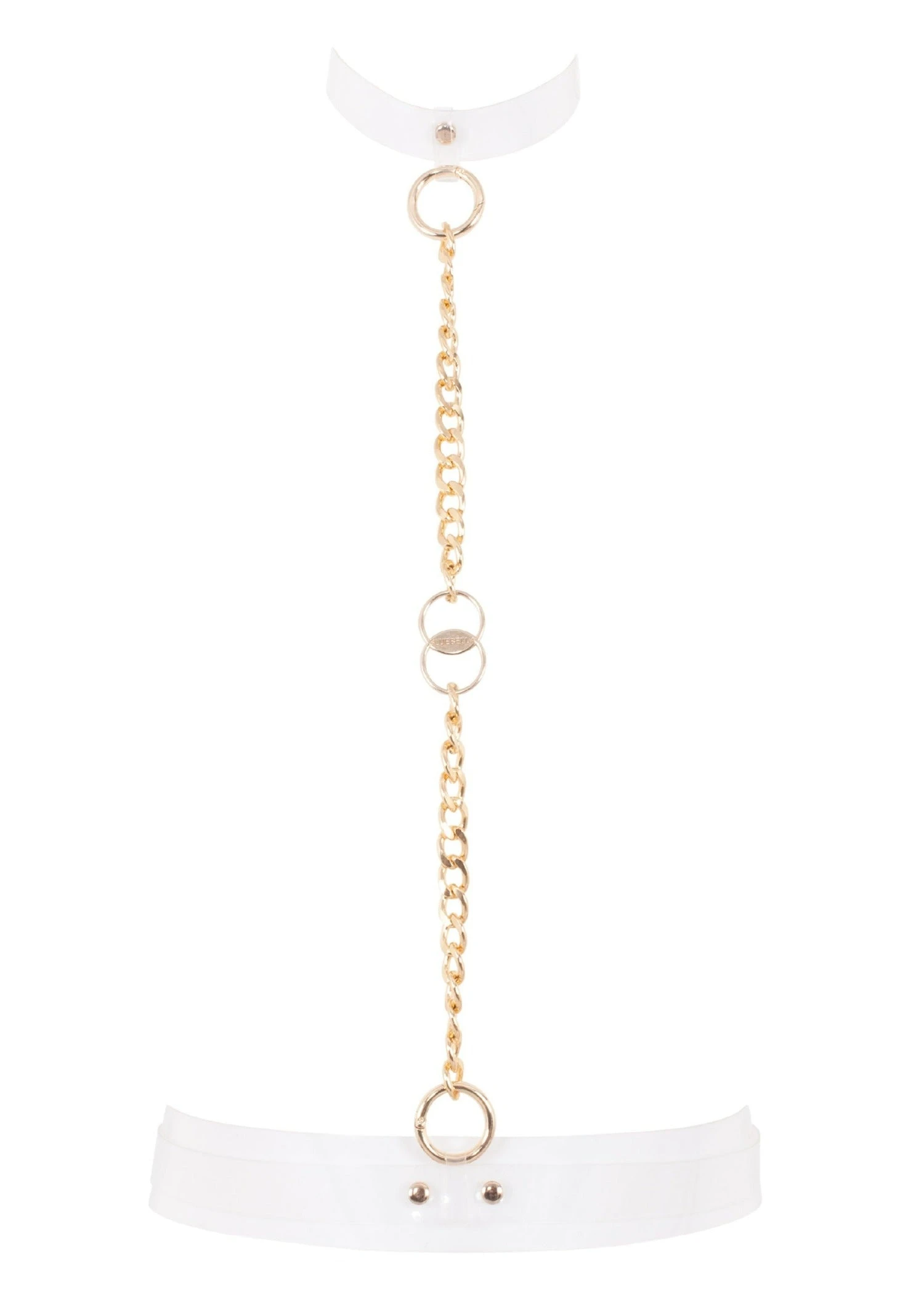 This striking and alluring fashion harness is the perfect statement piece. The transparent bands and gold-tone chain making this harness a must-have for any fashionista. Match the Daniela Harness with lingerie, or over clothes for a chic and stylish look.