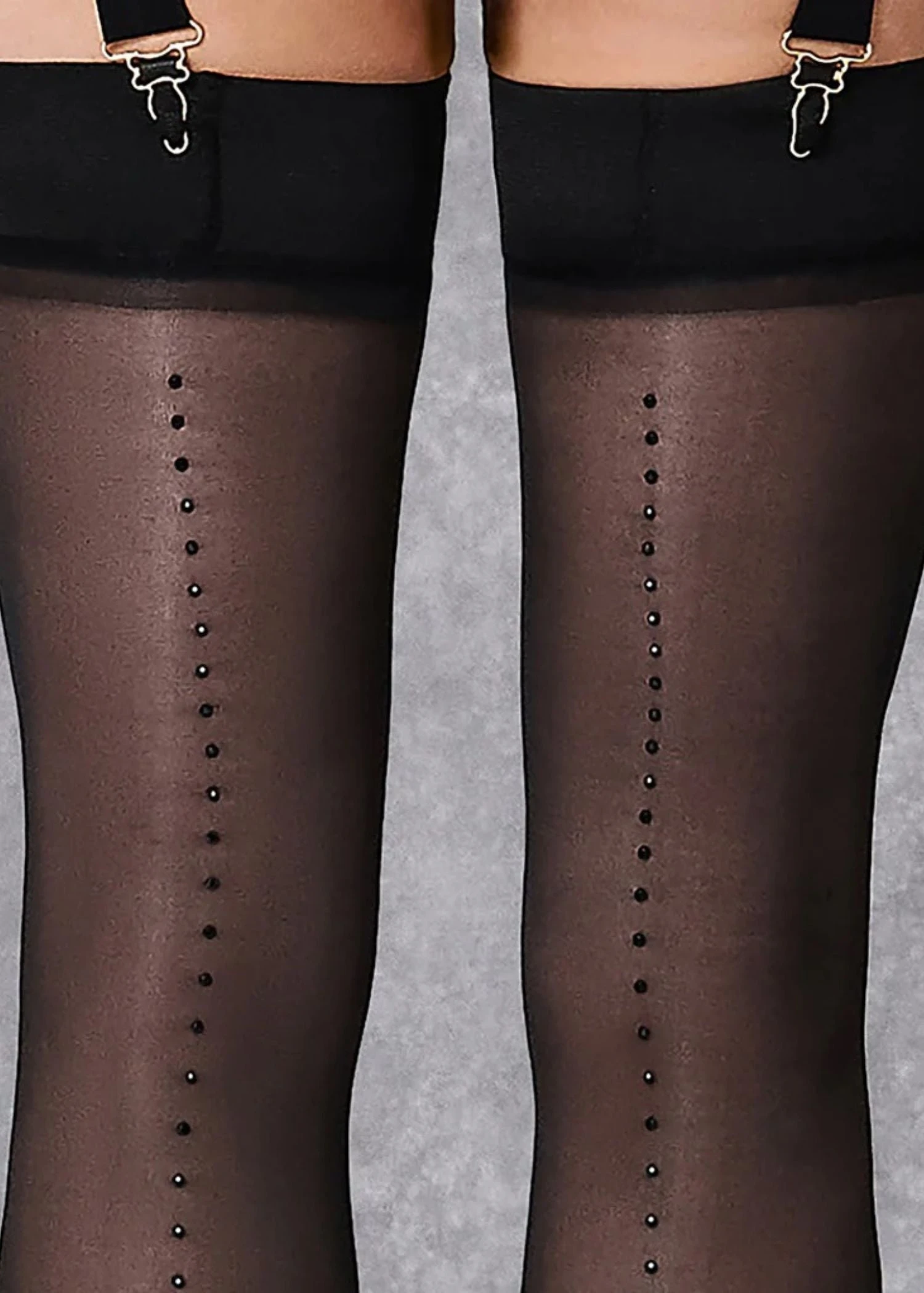 Seemingly entirely minimal in their design, these luxe stockings reveal a sleek line of sparkling diamantes to the reverse, adding a subtly dazzling finish to your lingerie sets, party outfits and more. Crafted in Italy to the highest standards, this unique pair begs to be styled with your favorite suspender belt for a contemporary twist on a classic look.