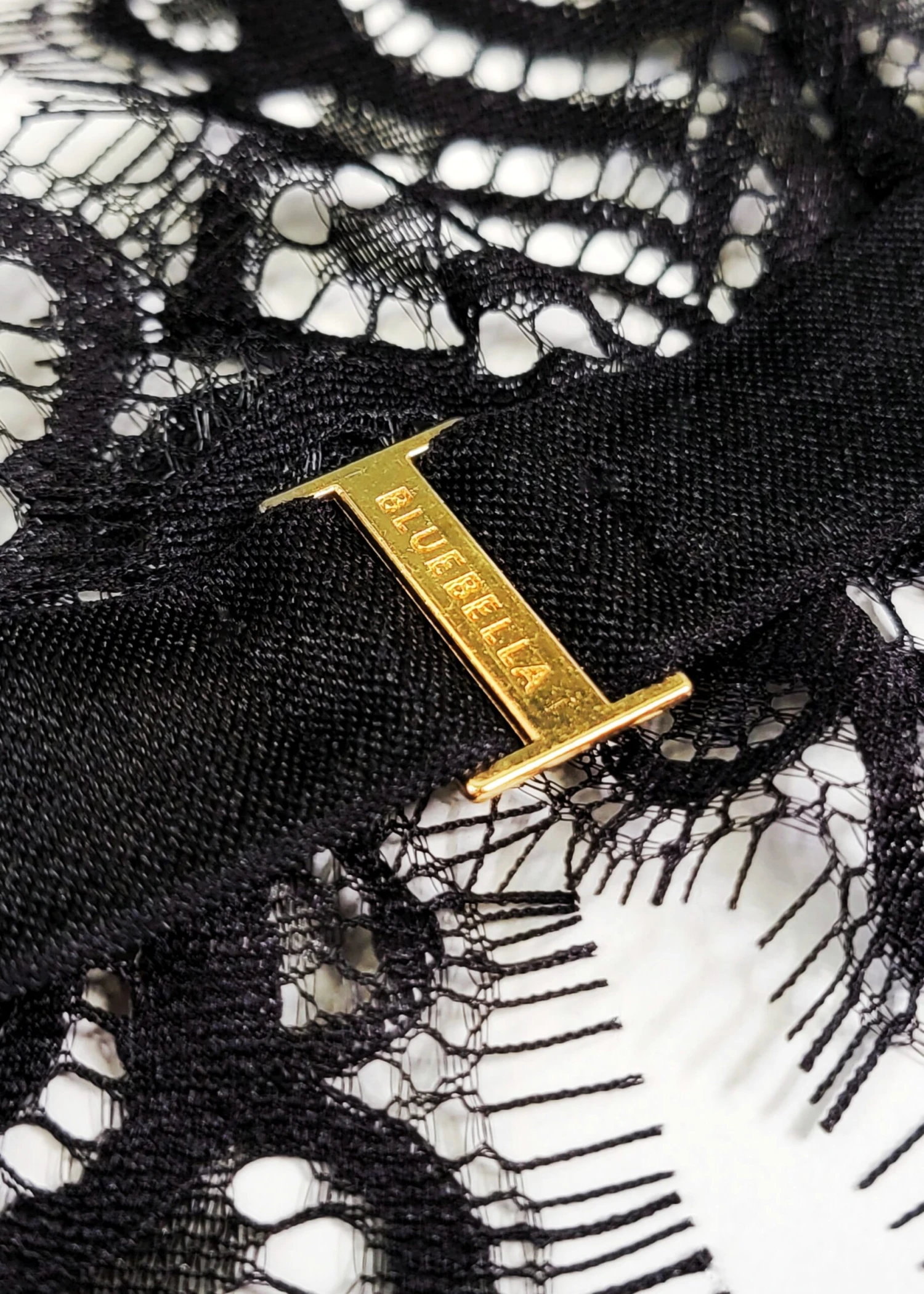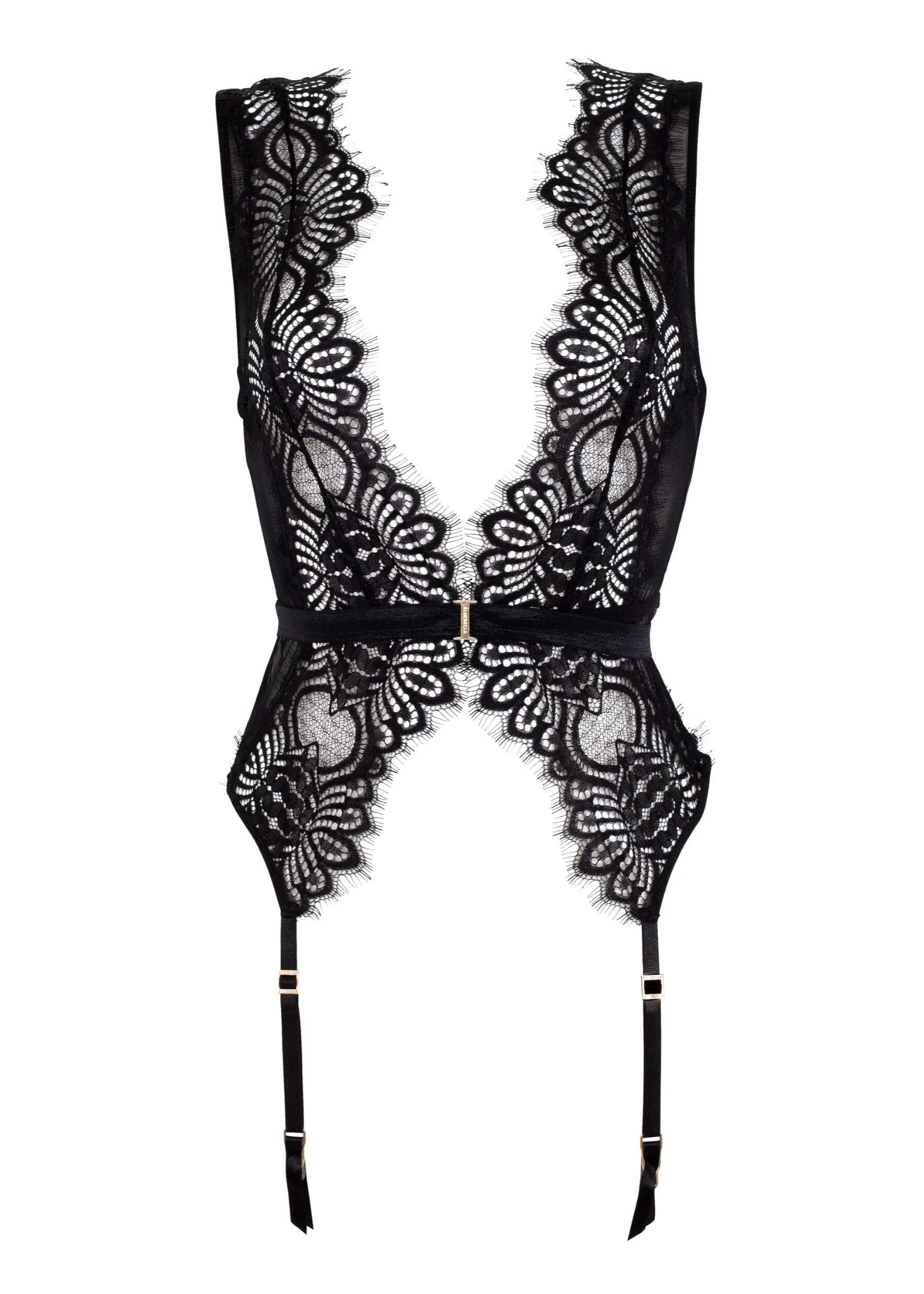 The Fenella Soft Basque is an eyelash-lace dream that draws the eyes to its unique textured silhouette and plunging neckline, along with eye-catching gold-tone hardware at the center.