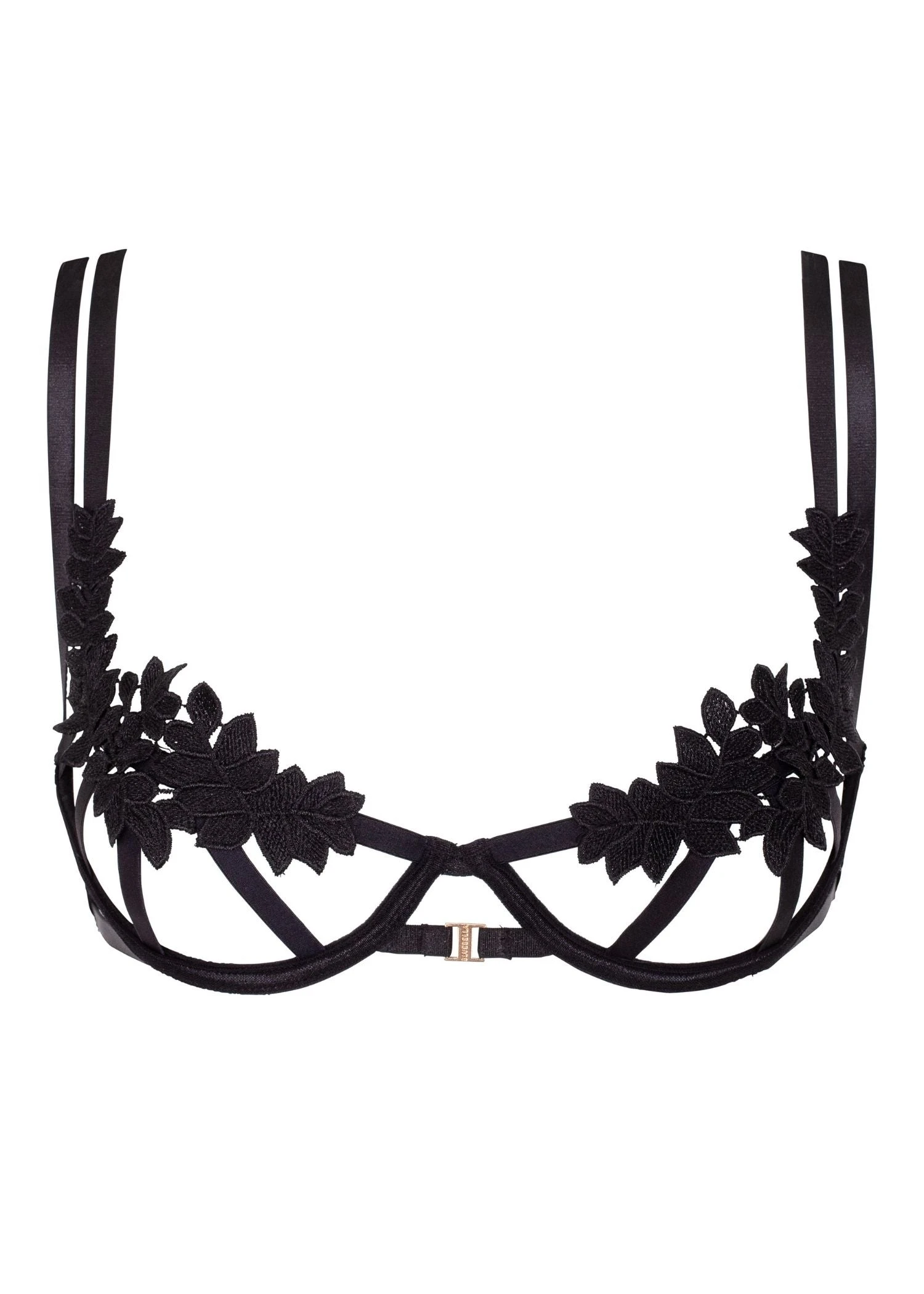 The Harley is a provocative cage-effect open bra with elegant botanical embroidery for an element of dimension and texture. Finished with double shoulder straps and a minimal gold-tone centerpiece.