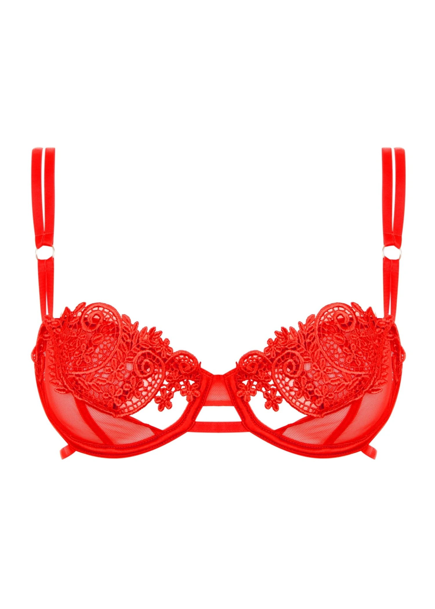 Combining elegant guipure lace with slim straps to create this exquisite piece, the Julienne Bra is an intricate and contemporary piece made with a lot of thought put behind. This statement piece has mesh underwire cups, cut-out details and triple straps for an edgy touch on this romantic piece.