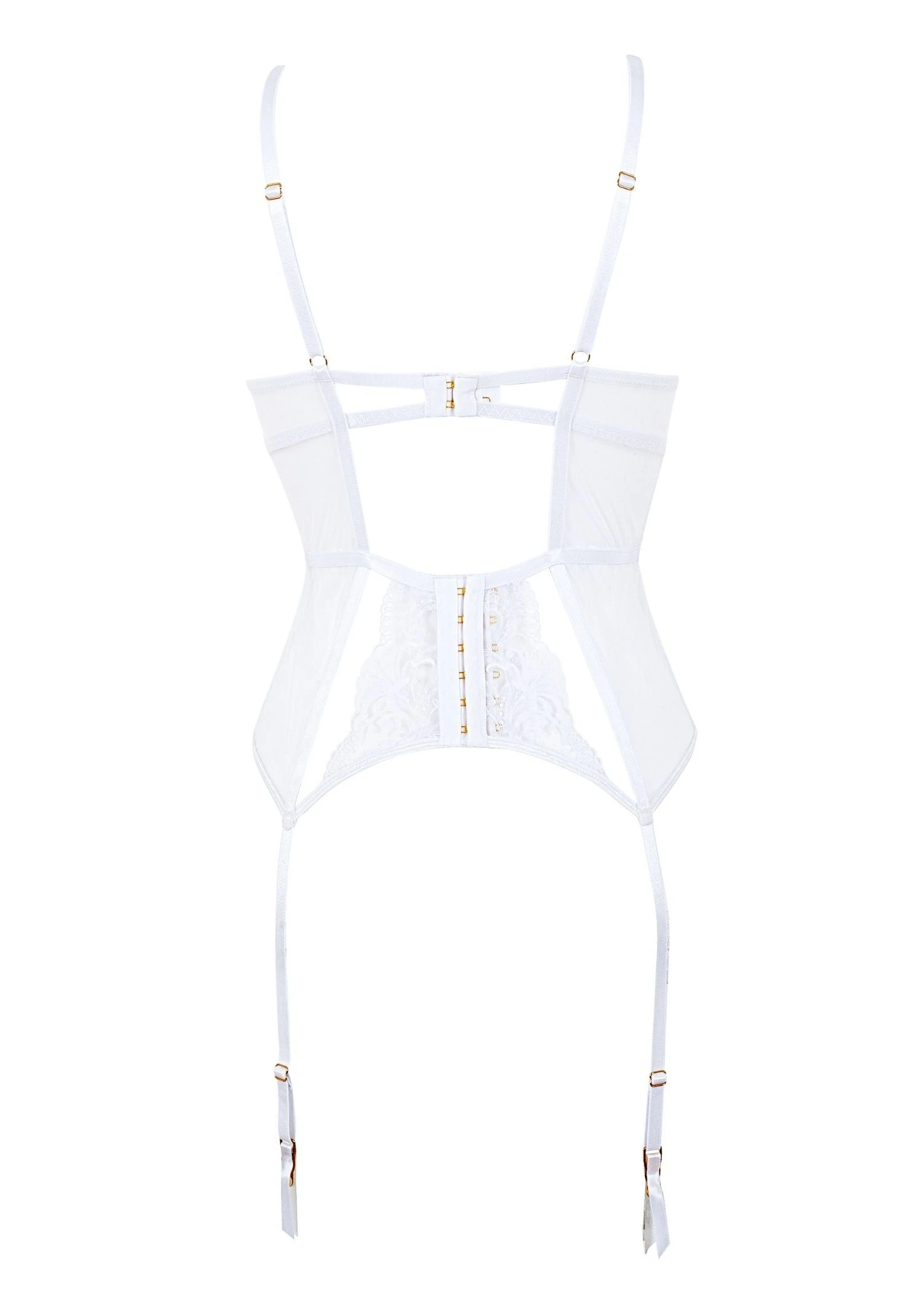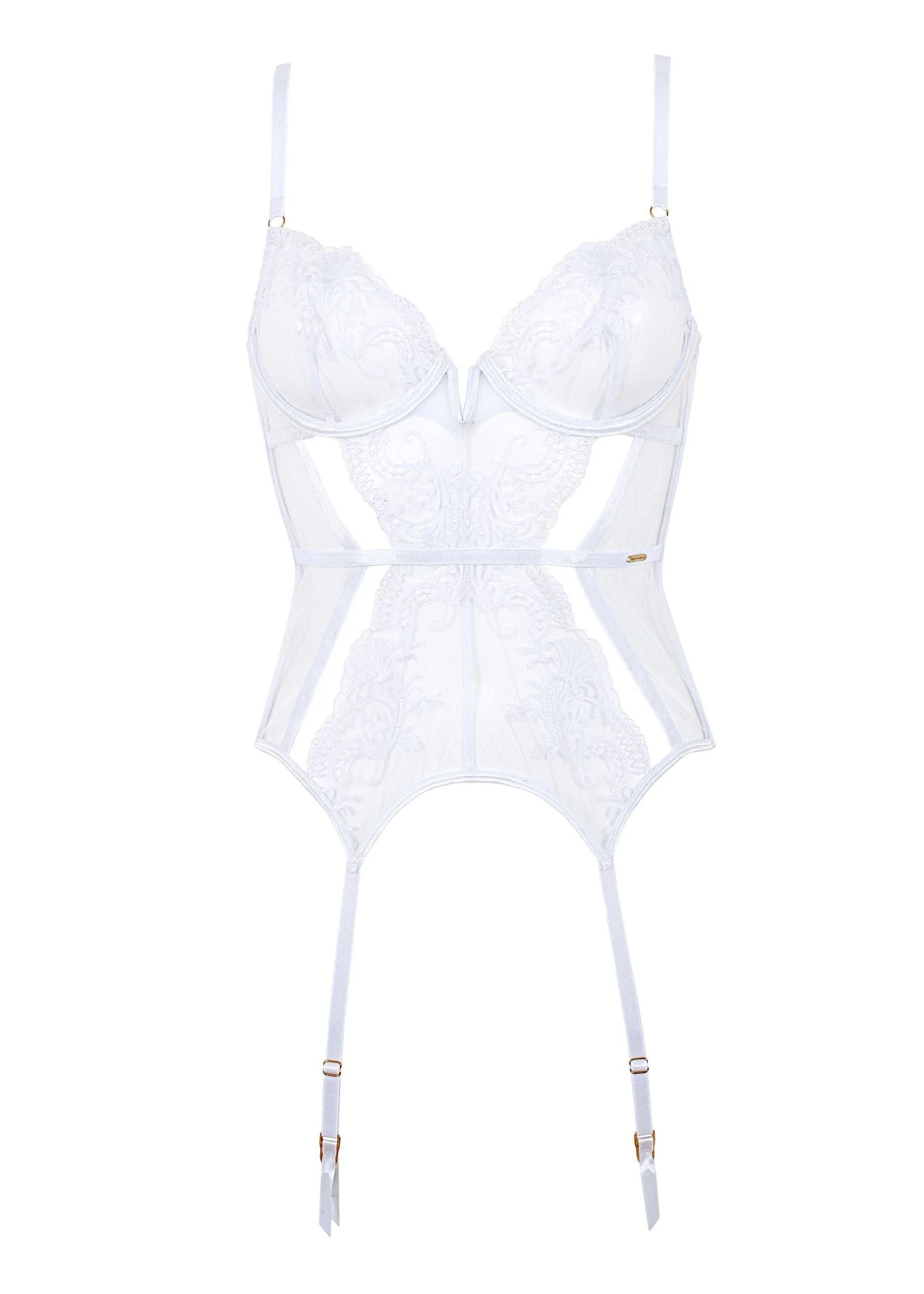 This gorgeous white Marseille Basque is the perfect bridal undergarment. Its daring, elegant floral swirl embroidery frames the bodice beautifully. With suspenders to attach your stockings for a timeless look.