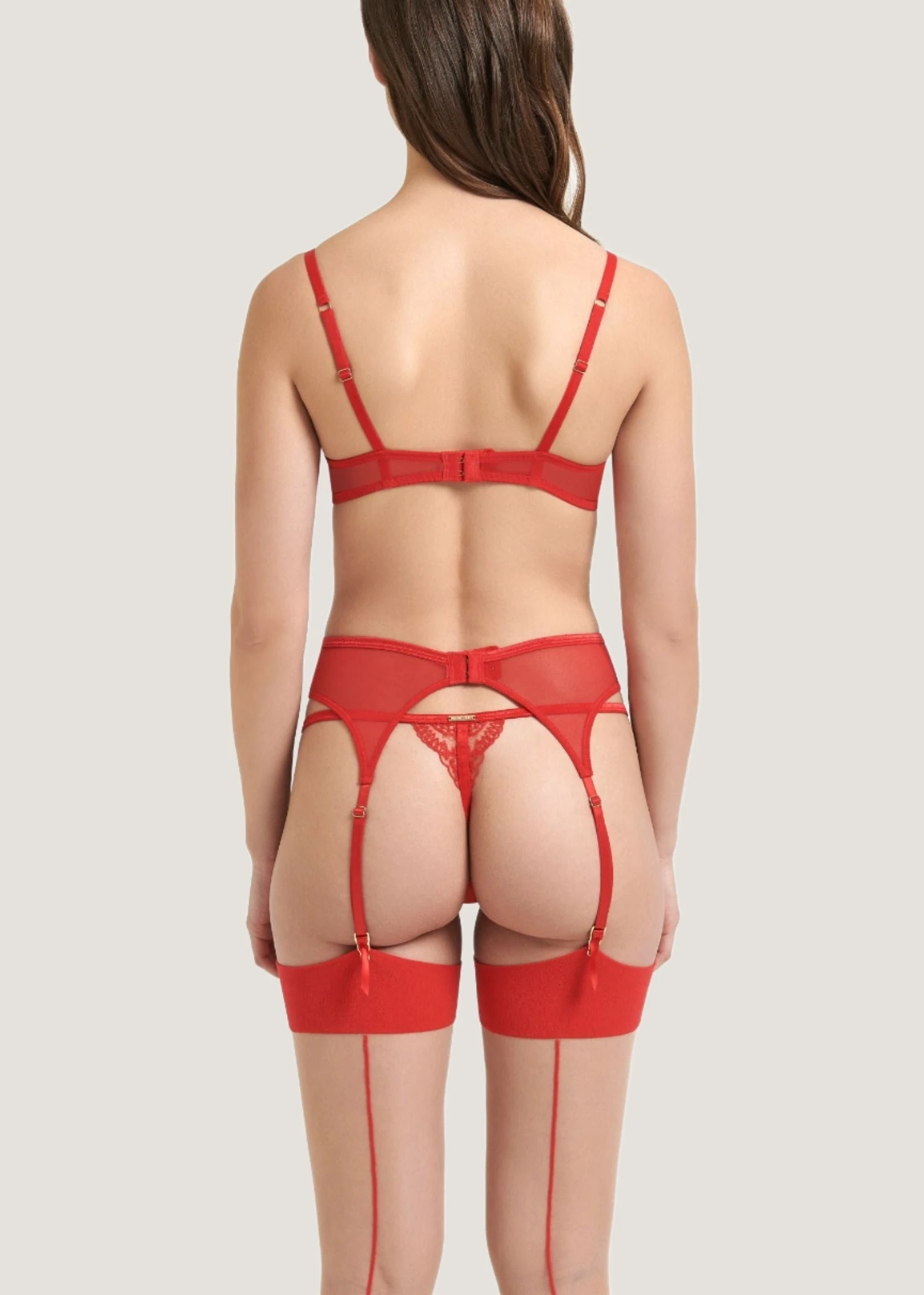 A beautifully simple suspender in a classic design. Fine mesh is embroidered with a swirling floral design along the front line that adds movement and delicacy. Securing with hook and eye fastenings in the back panel, the belt sculpts the waist and flatters the body, whilst the adjustable suspender straps are finished with gold-tone clasps and satin ribbon flashes. Wear with the Marseille Bra, Brief and Bluebella Hosiery for a gorgeous complete lingerie look.