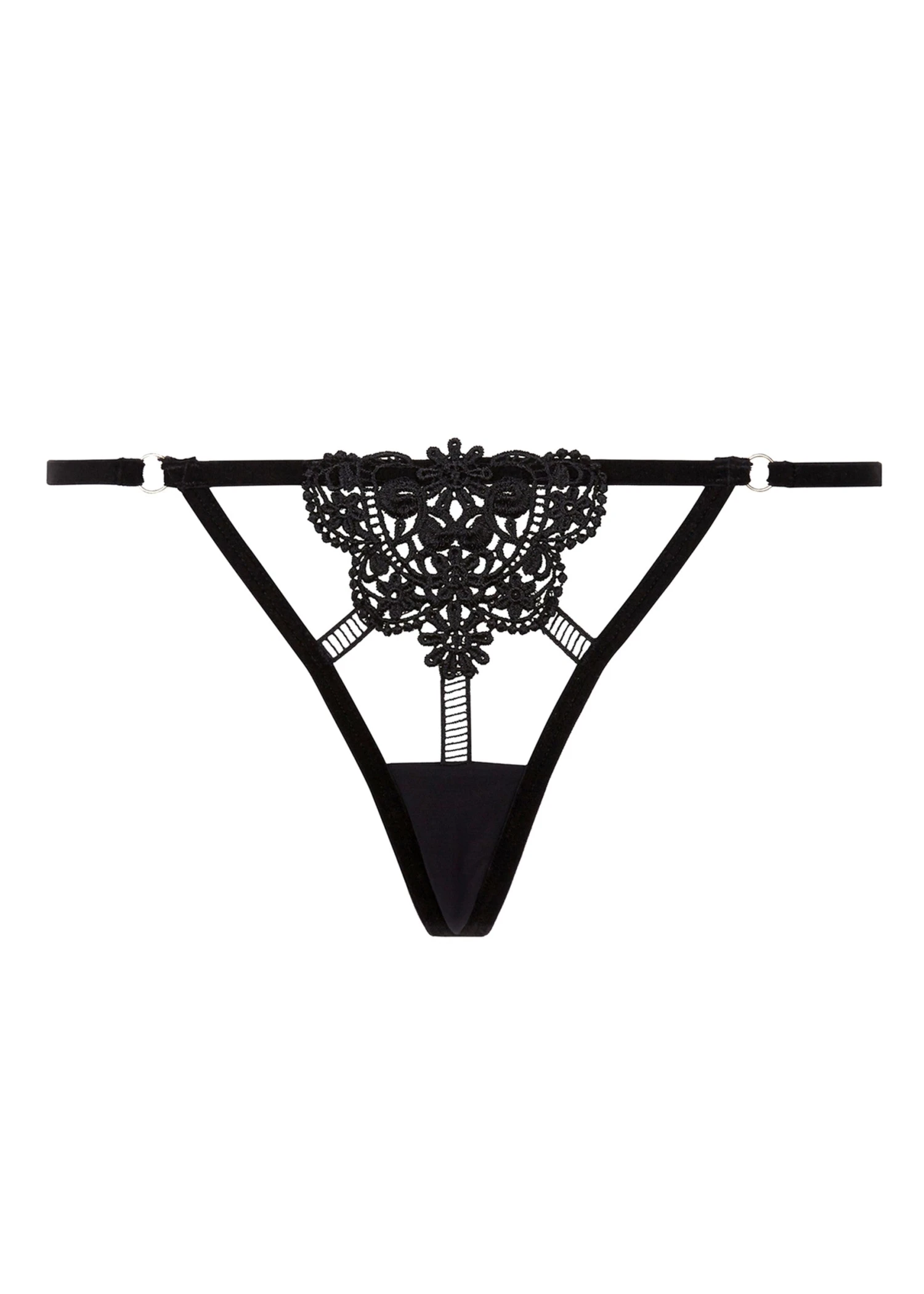 Playful and provocative, the Bluebella Pandora Thong made with stretch velvet has a barely-there silhouette. The guipure lace trims, cut-outs and intricate crochet lace accents makes this piece and absolute must-have. Style with the matching bra.