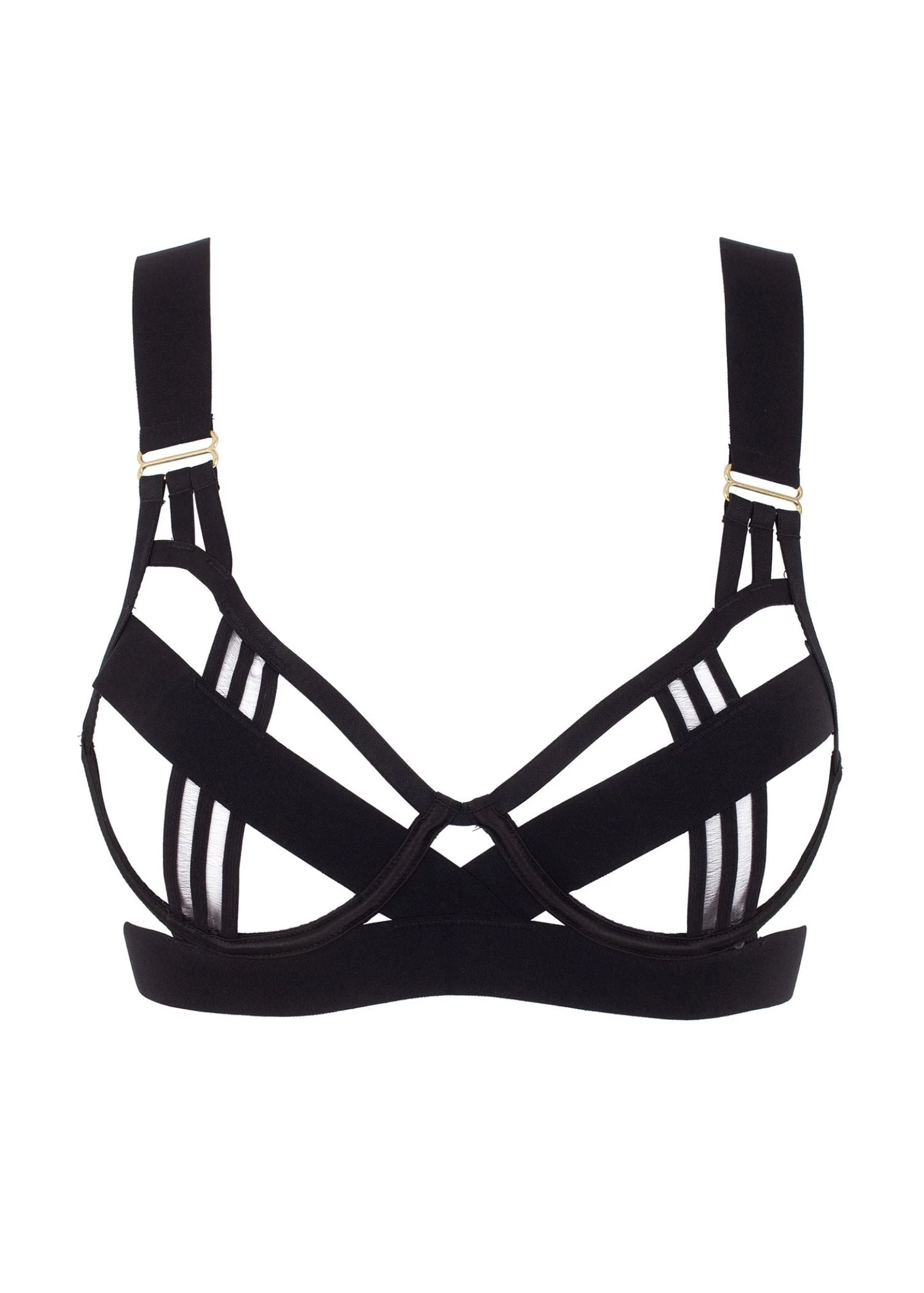 Bluebella’s contemporary bondage style bra featuring thick directional elastic straps across the cups, underwired for support. This bold piece brings confidence and attitude to the next level.