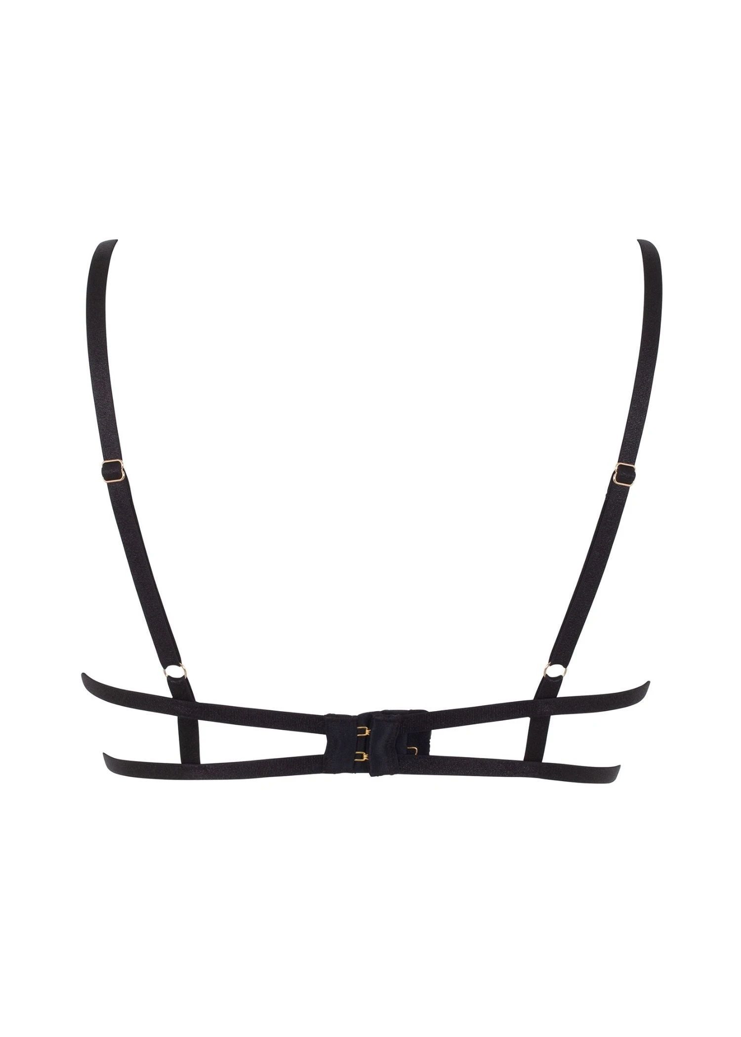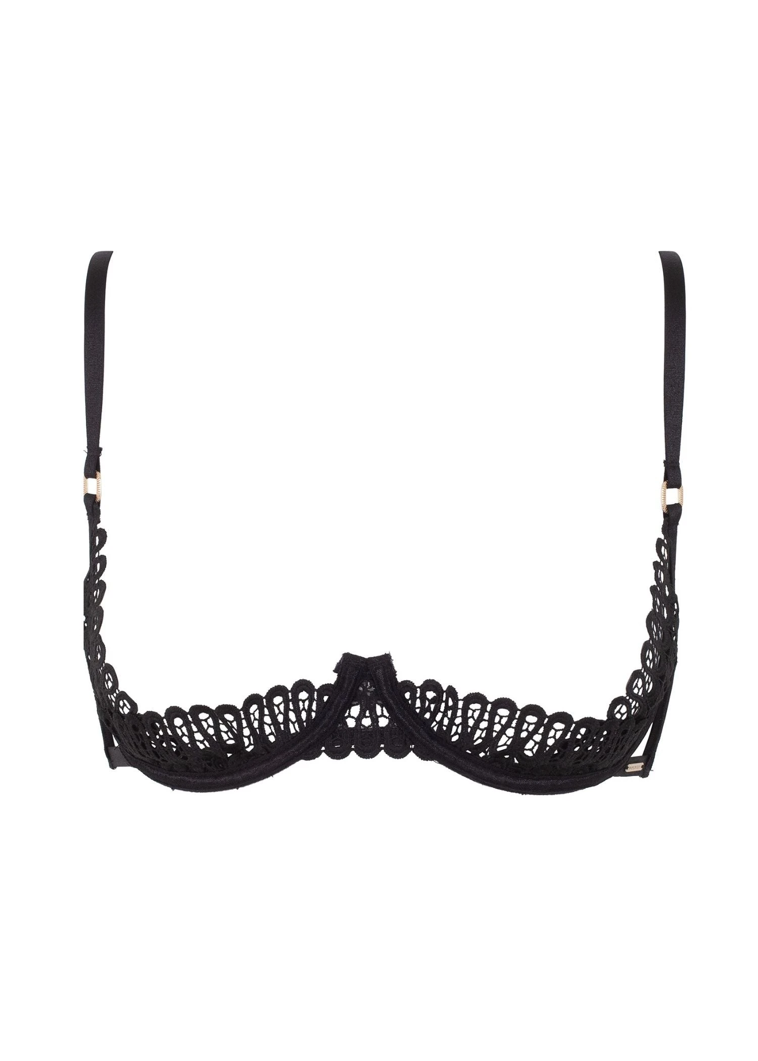 Looking for a sexy, seductive bra that will frame your bust? This black open bra features intricate crochet-like embroidery that will make you feel glamourous and sexy. The underwired design provides ample support. Style this with matching nipplets to complete the look.