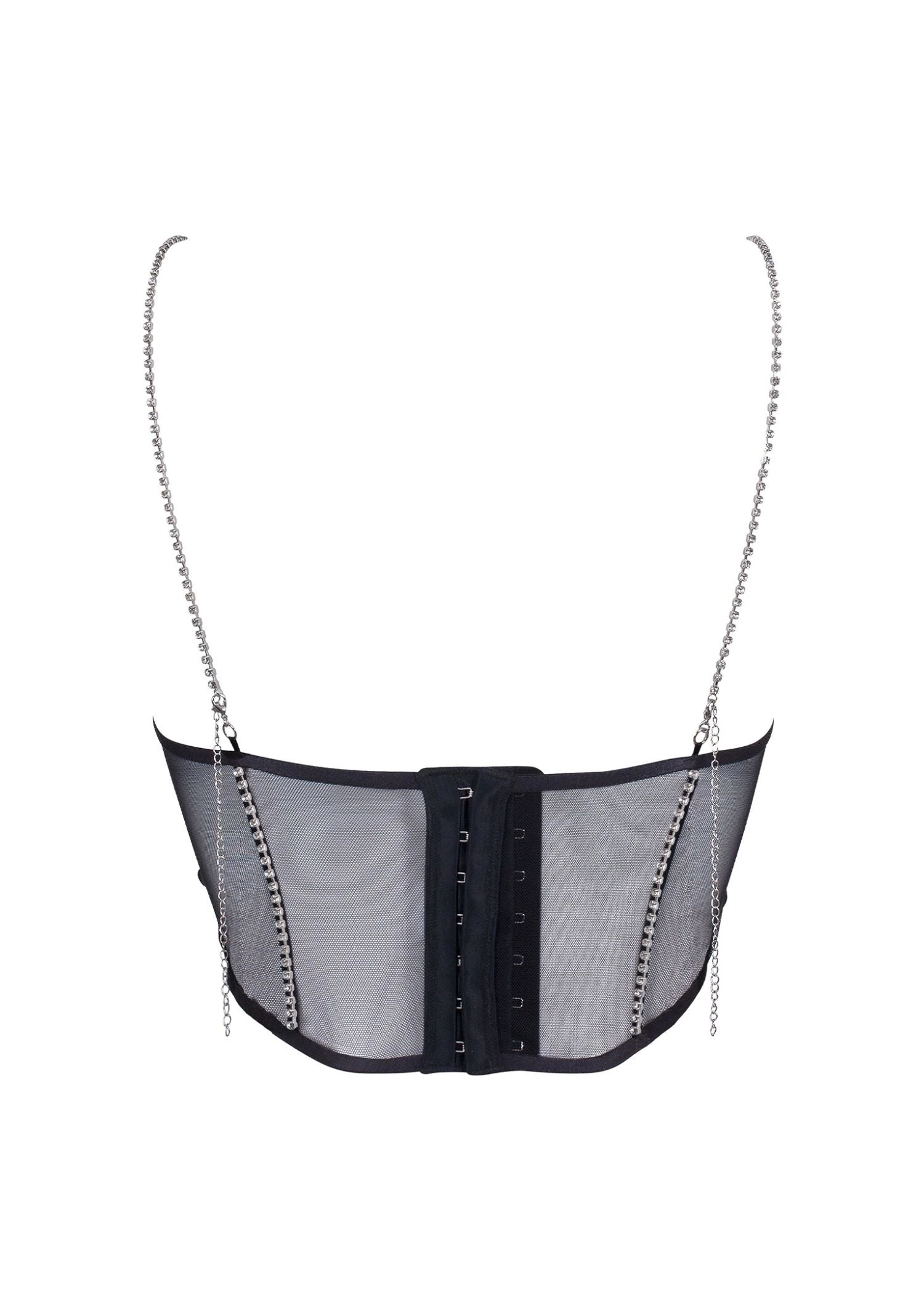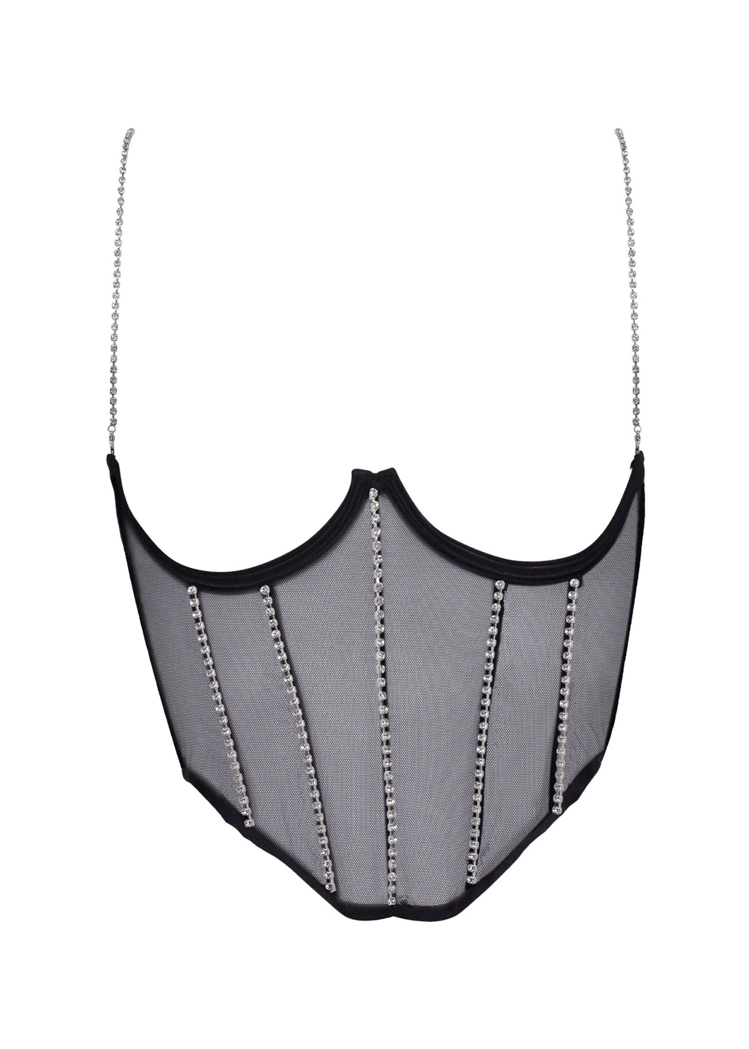 Blurring the line between art and fashion, the showstopping Zenn bustier will steal the hearts of fashion-forward lingerie lovers with its unique design and flattering silhouette. Enlivened with a touch of stylish sparkle courtesy of the shimmering diamantes to the straps and bodice, this daringly ouvert bustier inspires styling possibilities for seasons to come. Embrace the dazzling credentials of this piece and style it with the matching Zenn nipple pasties and thong.