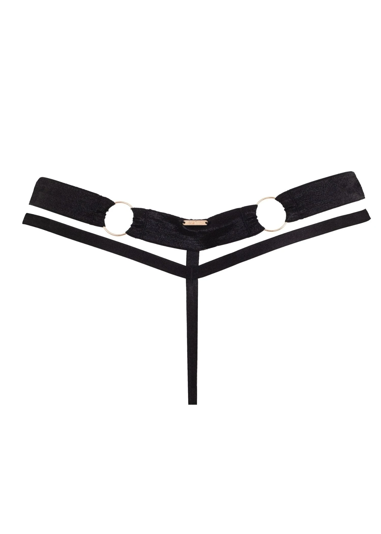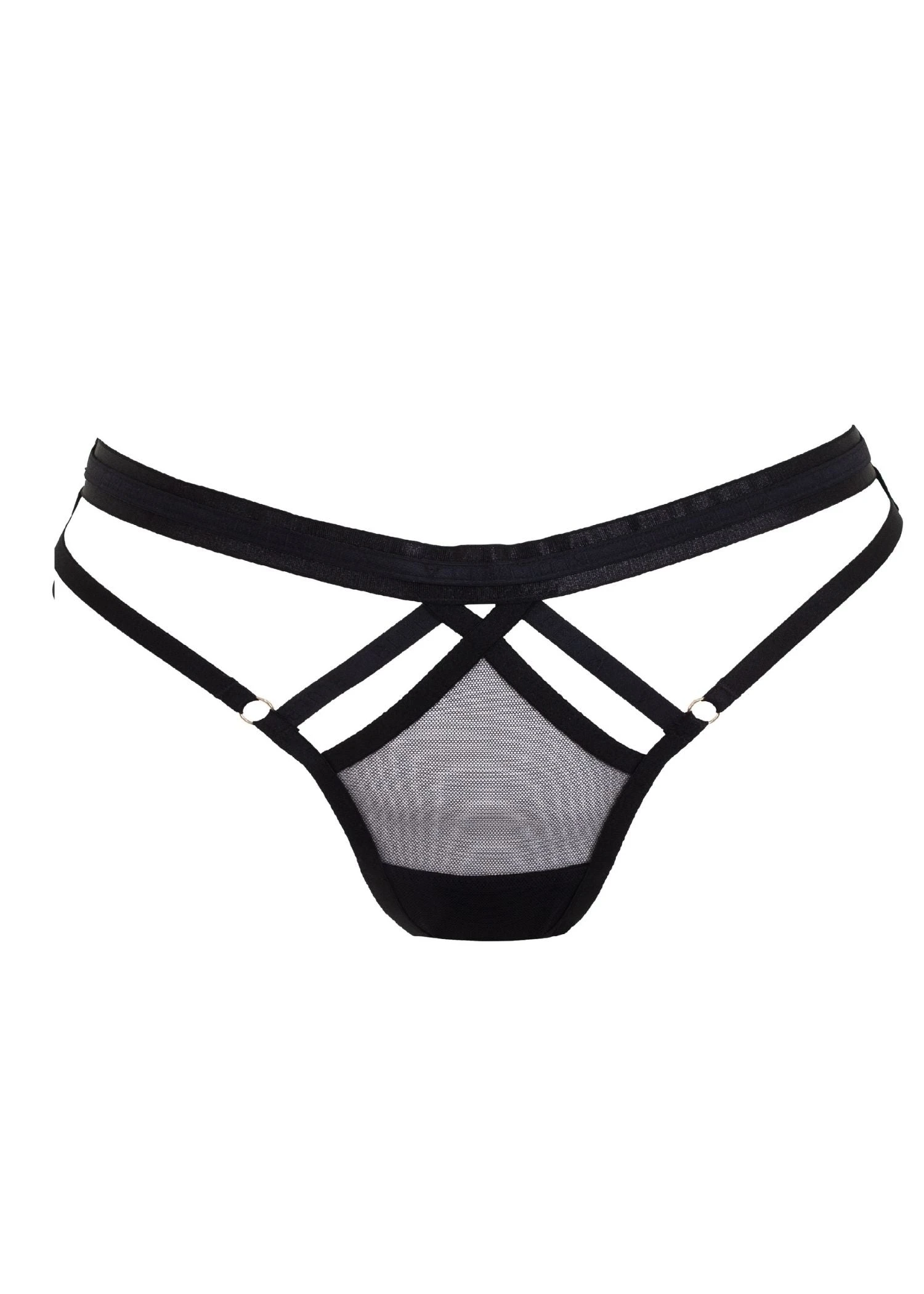 The Zuri Thong is a statement piece that combines wide and slim strapping with structural cut-outs. Tied together with a sheer mesh front panel and gold-tone details. Pair with the Zuri Harness Thong for the complete look.