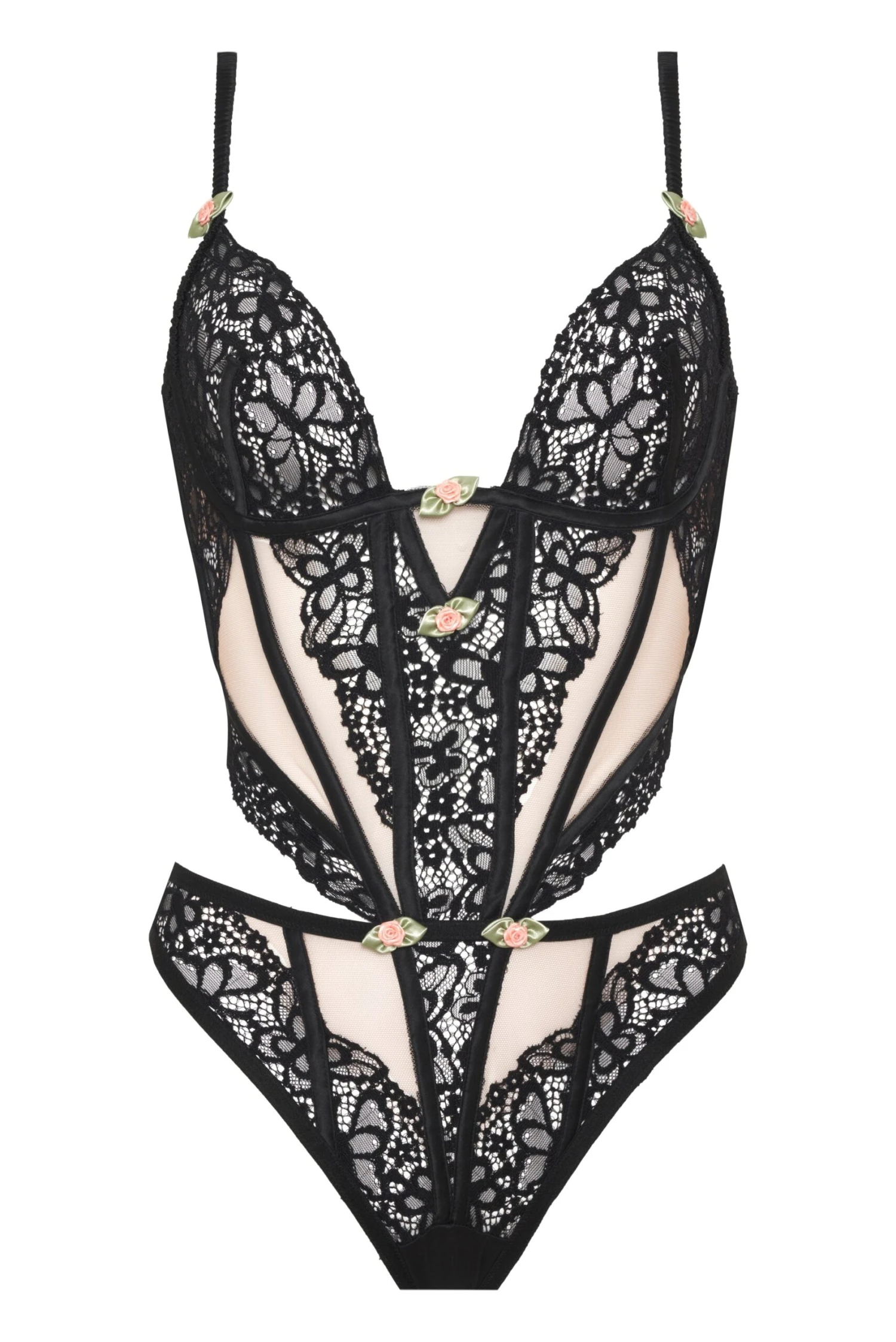 Butterflies sweep across this luxe lace design finished with cutouts and mesh panels and dotted with satin rosettes.