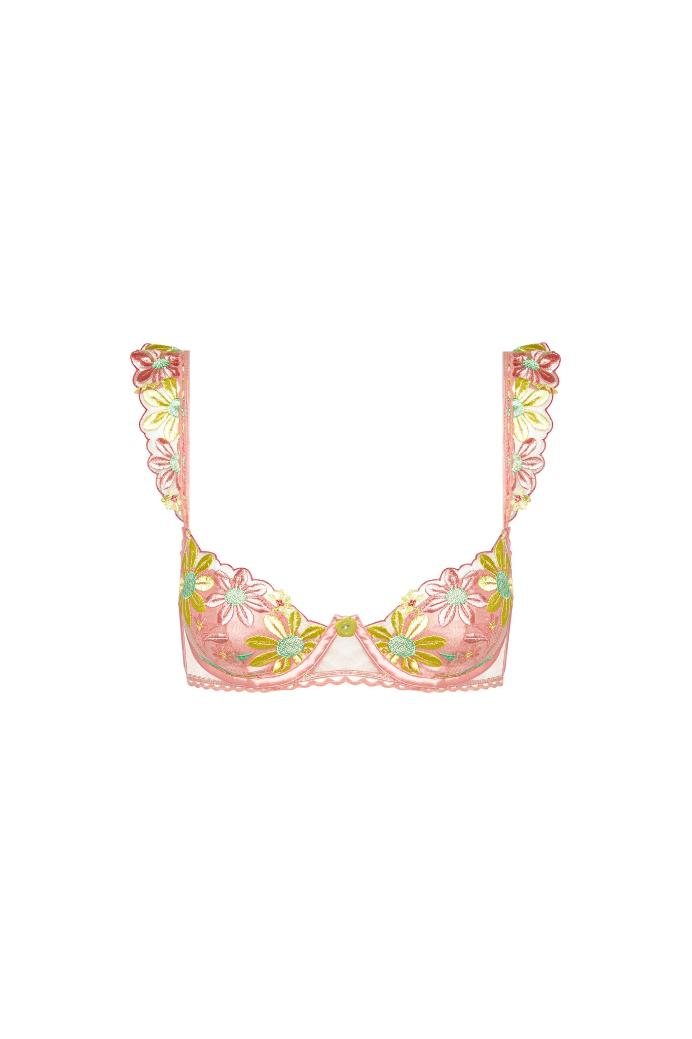 When it comes to this pretty pastel bra, there’s no wondering if “She loves me” or “She loves me not.” A spray of colorful daisy appliqués lends a retro pop to its scalloped demi cups and ruffled straps. Make it a set with the matching Daisy Jane panty.