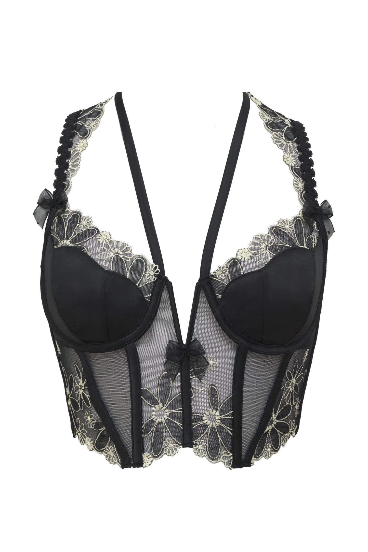 Discover the darker side of daisies in a vampy black corset top embroidered with sweet yellow blooms. Featuring sheer mesh panels and a plunging V-wire between the satin cups. Pair with the matching panty and garter belt.