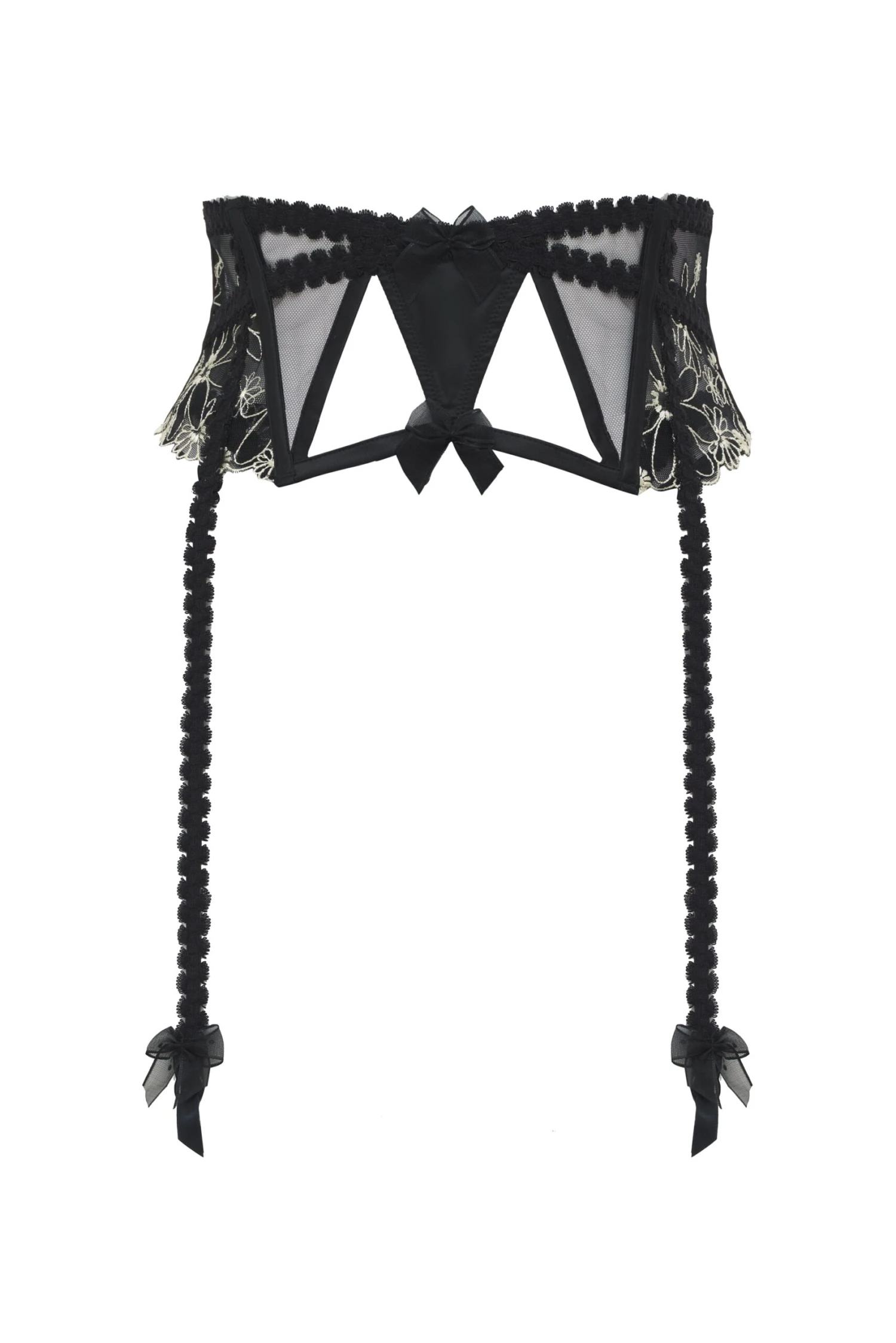 Discover the darker side of daisies in a vampy black garter belt embroidered with sweet yellow blooms. Featuring rickrack trim and straps that invite your favorite thigh-highs, plus a lace-up detail in back. Pair with the matching bra and panty.
