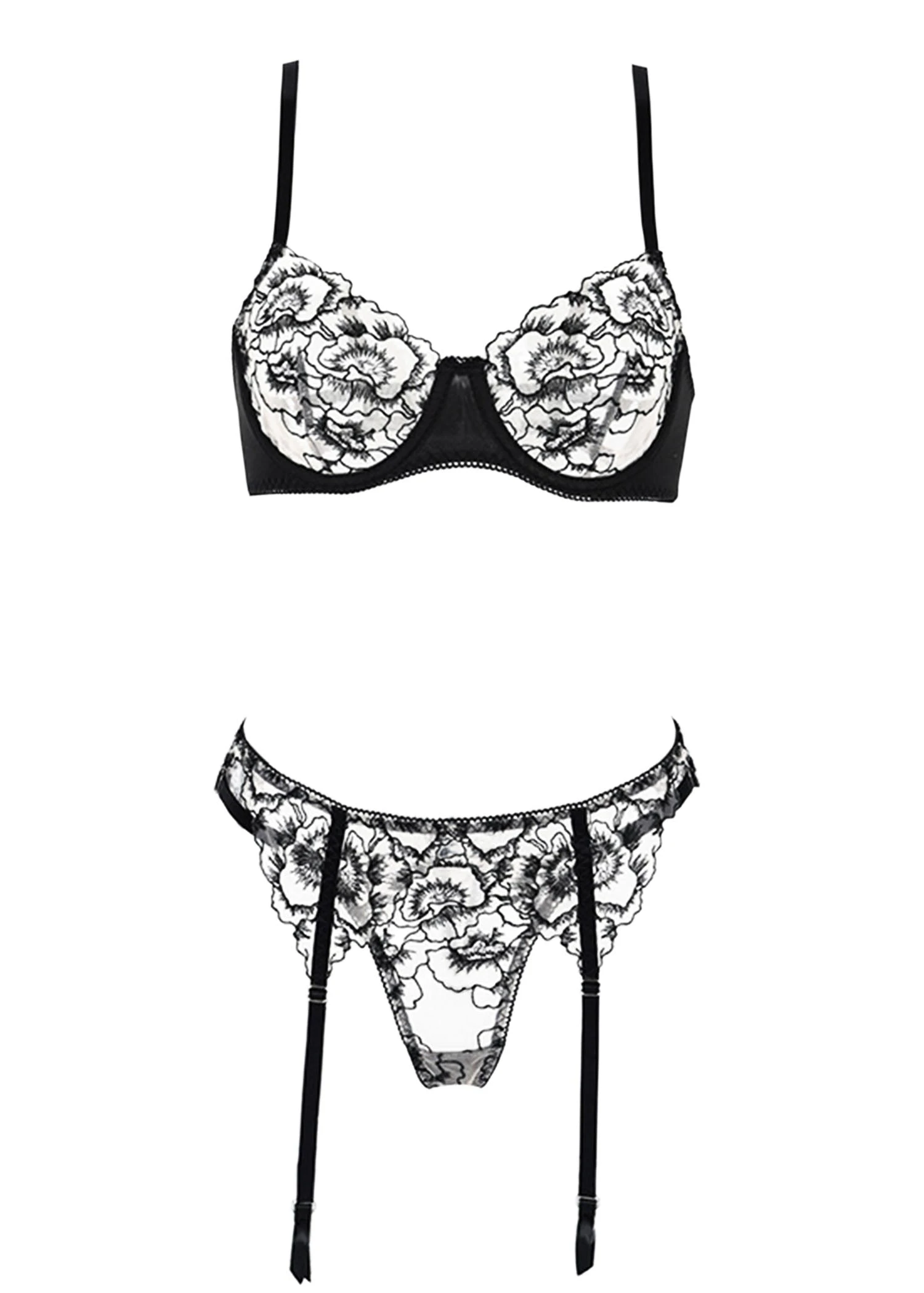 - 3 piece set includes: Bra, Thong, and Suspender