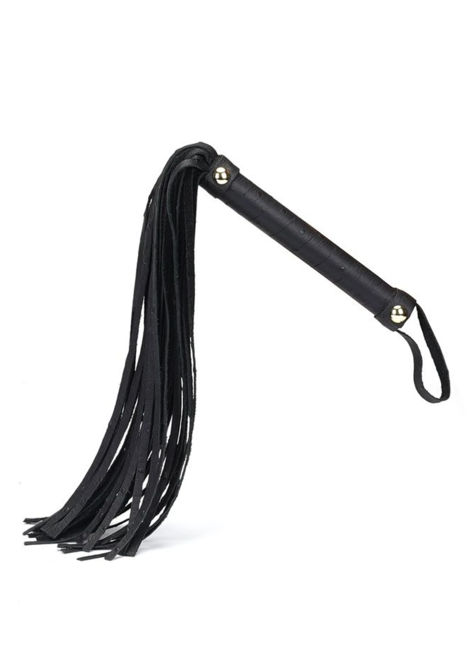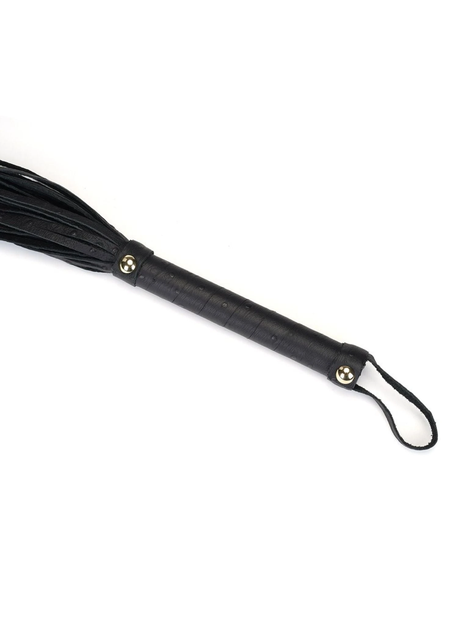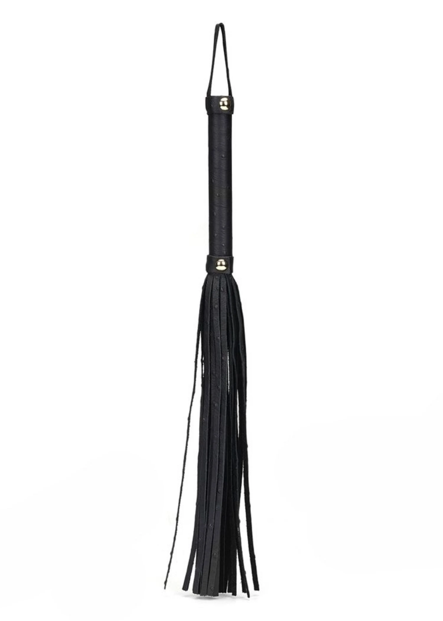 Explore the world of impact play with the Demon’s Kiss Flogger. Featuring soft real leather, ostrich skin pattern leather at the handle and gold accents for a luxurious touch.