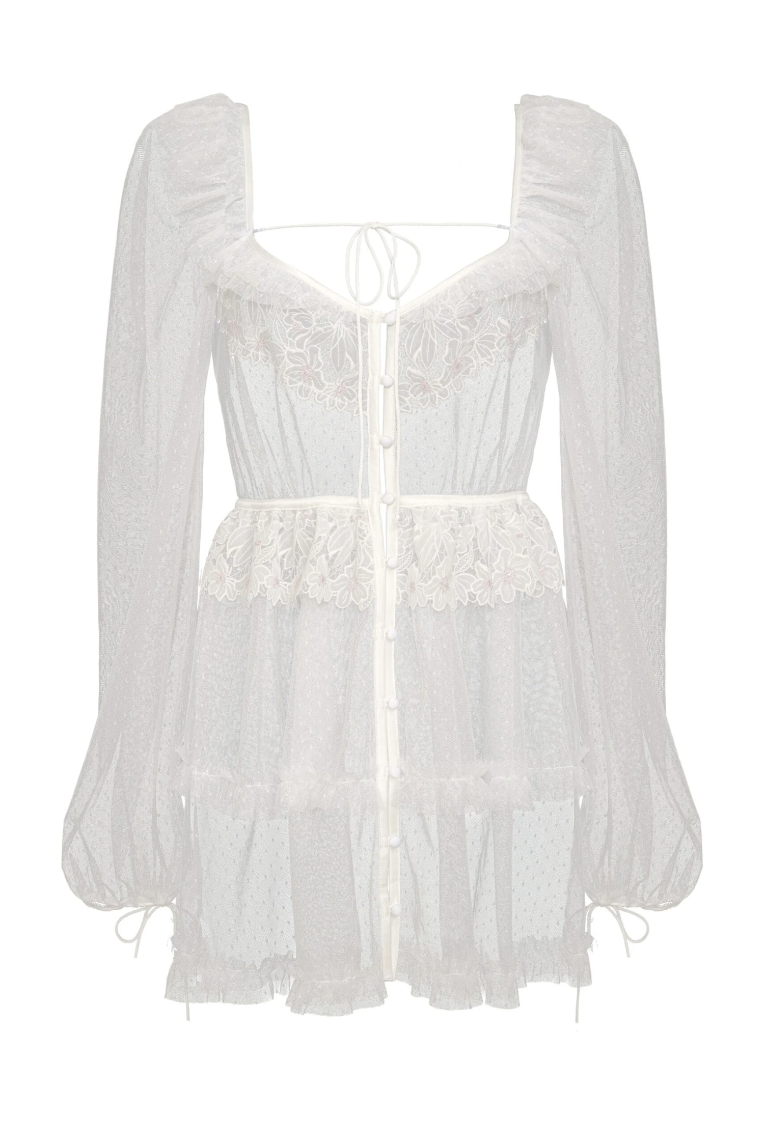 For truly memorable moments, this sheer piece features voluminous sleeves, satin-covered buttons, and a dramatic open back.