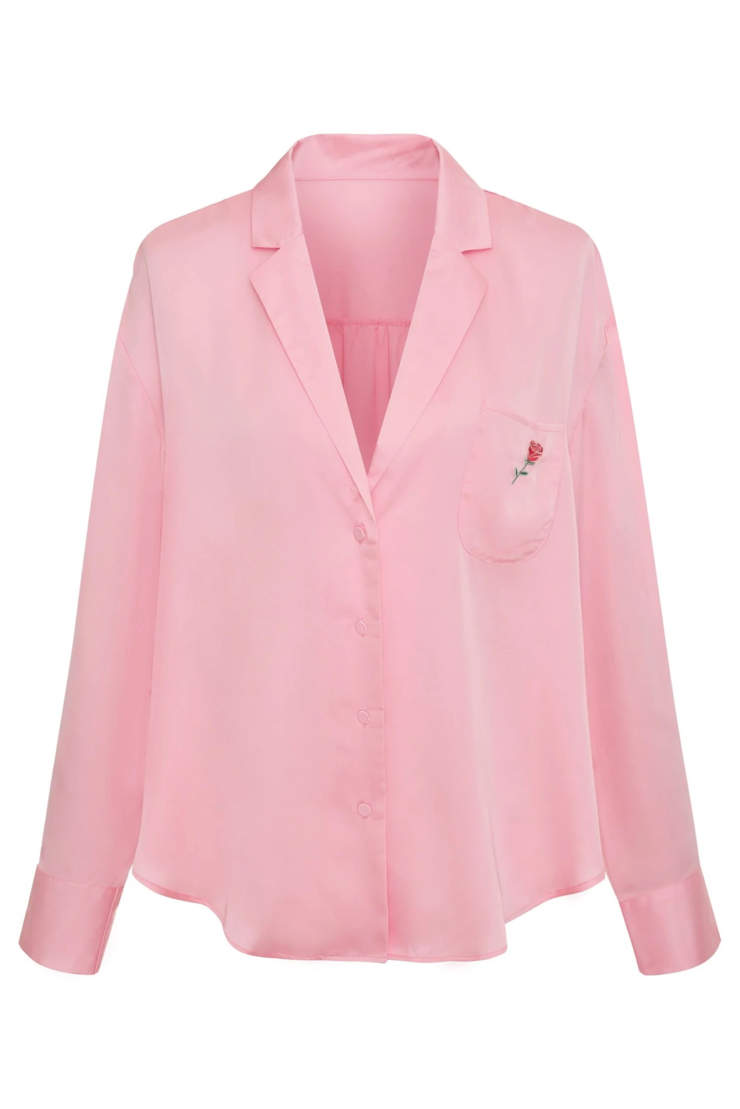 Comfy never looked so cool. Smooth satin gives this oversized style a flirty feel. Finished with a rose-embroidered patch pocket, notched collar, and covered buttons.