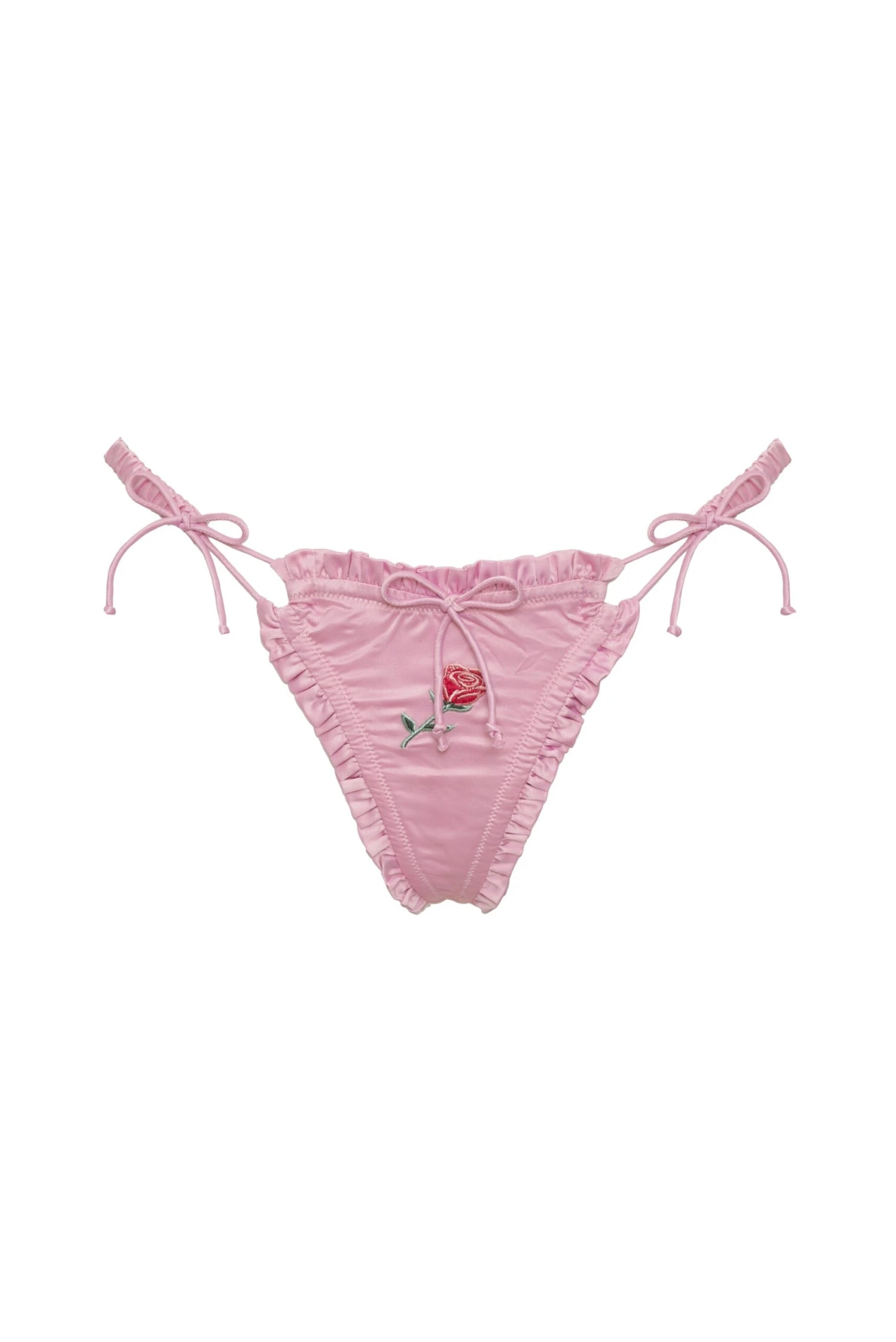 Comfy never looked so cool. Smooth, satiny fabric with ruffled edges gives this style a flirty feel. Finished with rosebud embroidery, skinny bows, and scrunchy hip straps.
