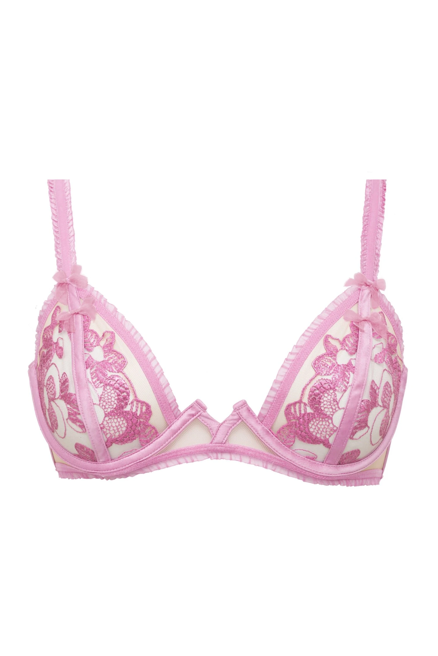 Pink isn’t just a color, it’s an attitude. This beautiful bra showcases the color with shimmery embroidery, ruffled trim, and organza bows. Strappy cutouts add an edgy touch.