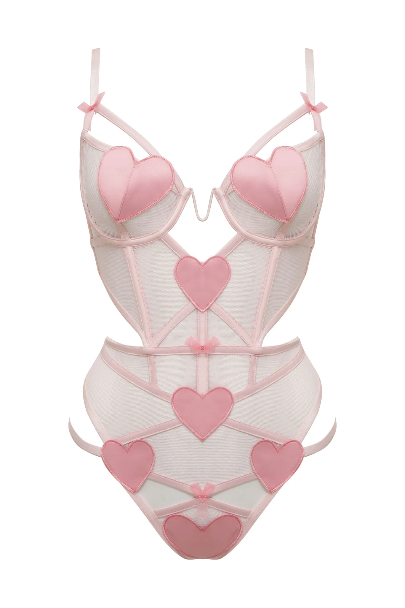 A scattering of pink heart appliques defines this pretty one-piece. Featuring sheer mesh, strappy cutouts, and a dramatic V-wire between the cups.