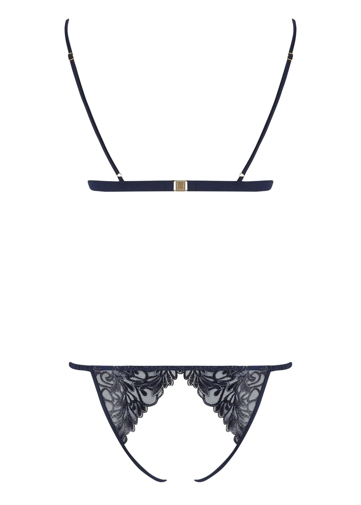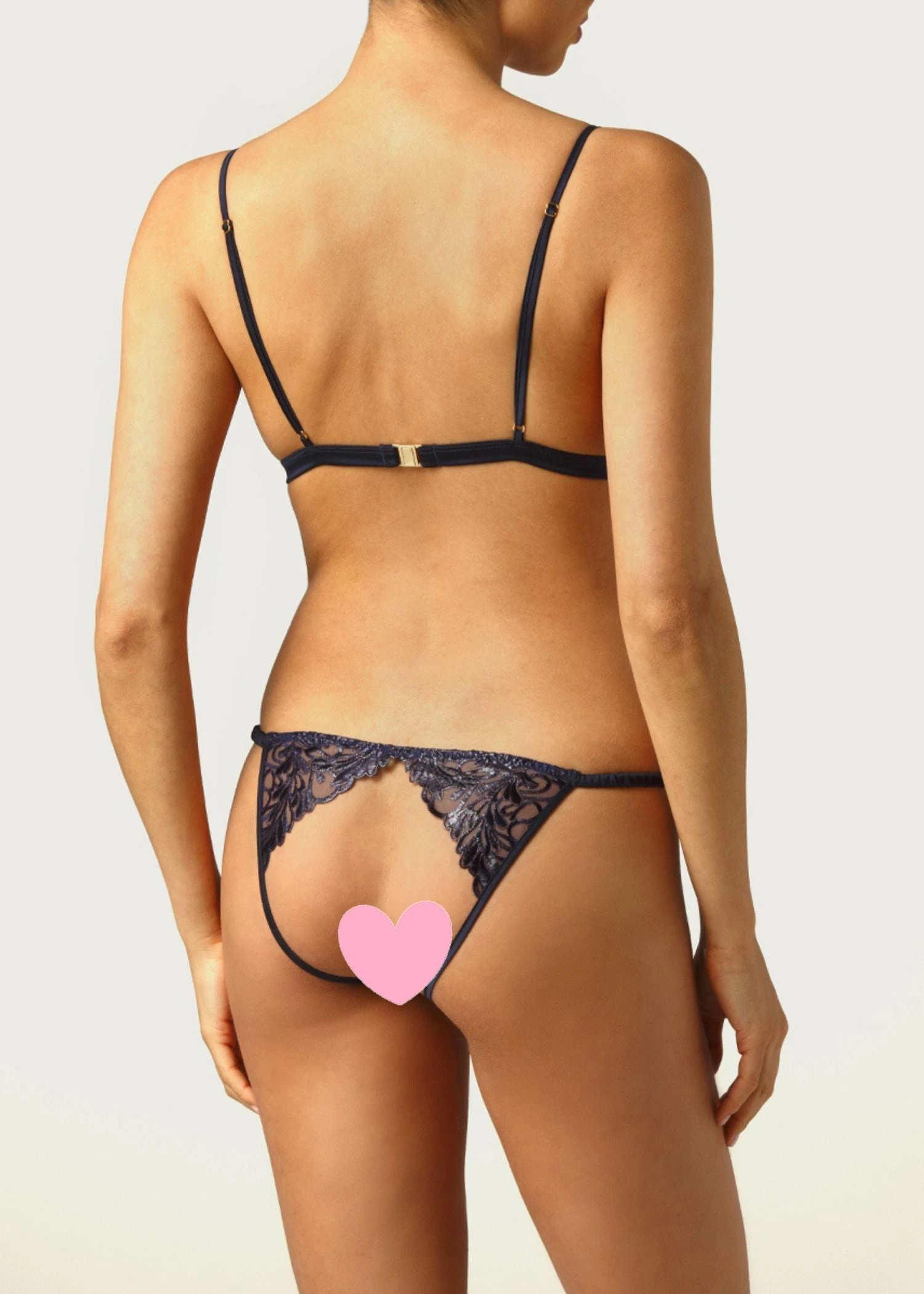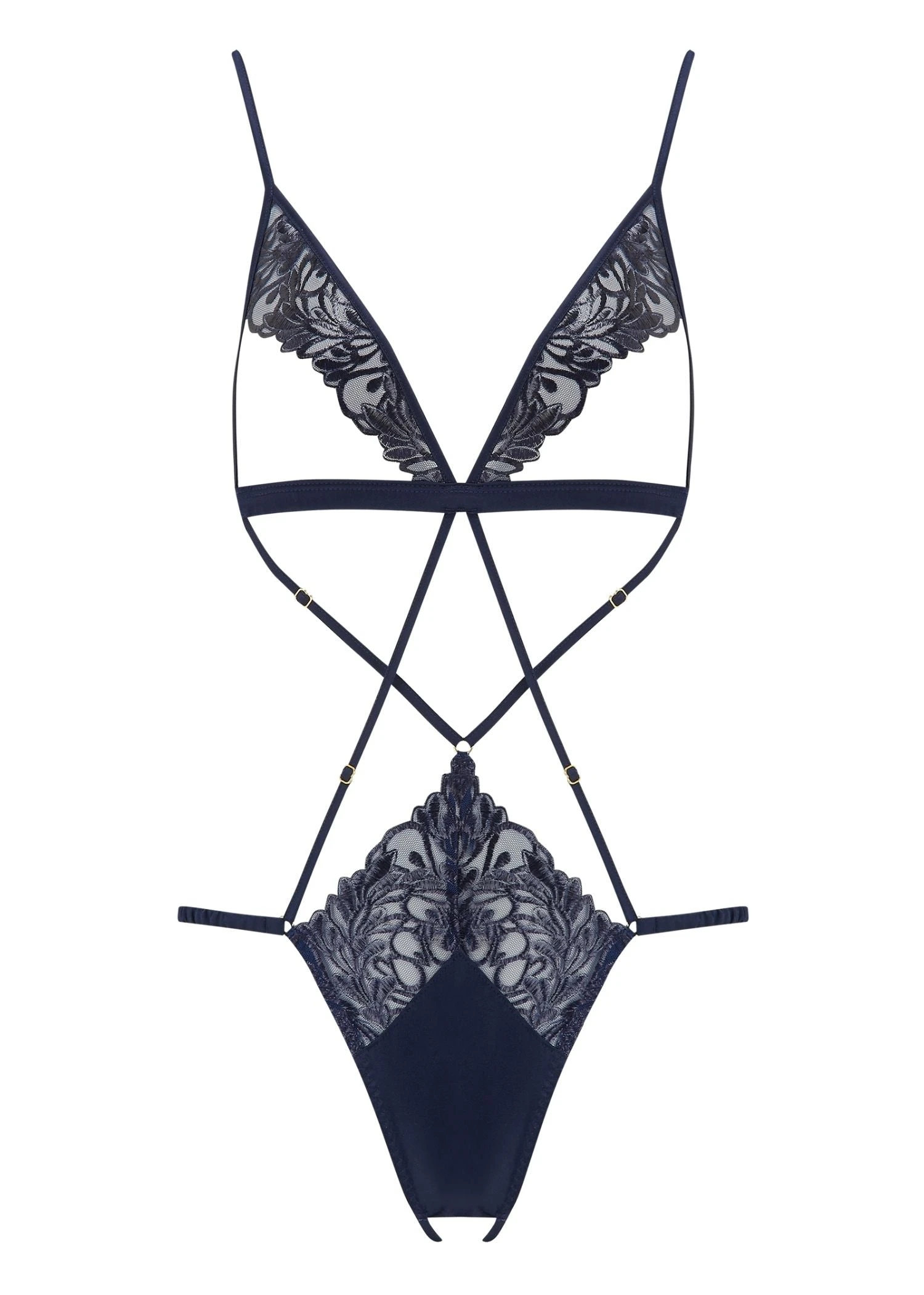 The Iris Playsuit takes a dive into midnight blue waters. Features seductive open cups laced with intricate embroidery, tracing the body with symmetric silk straps to reach an embroidered sheer panel and open knickers.