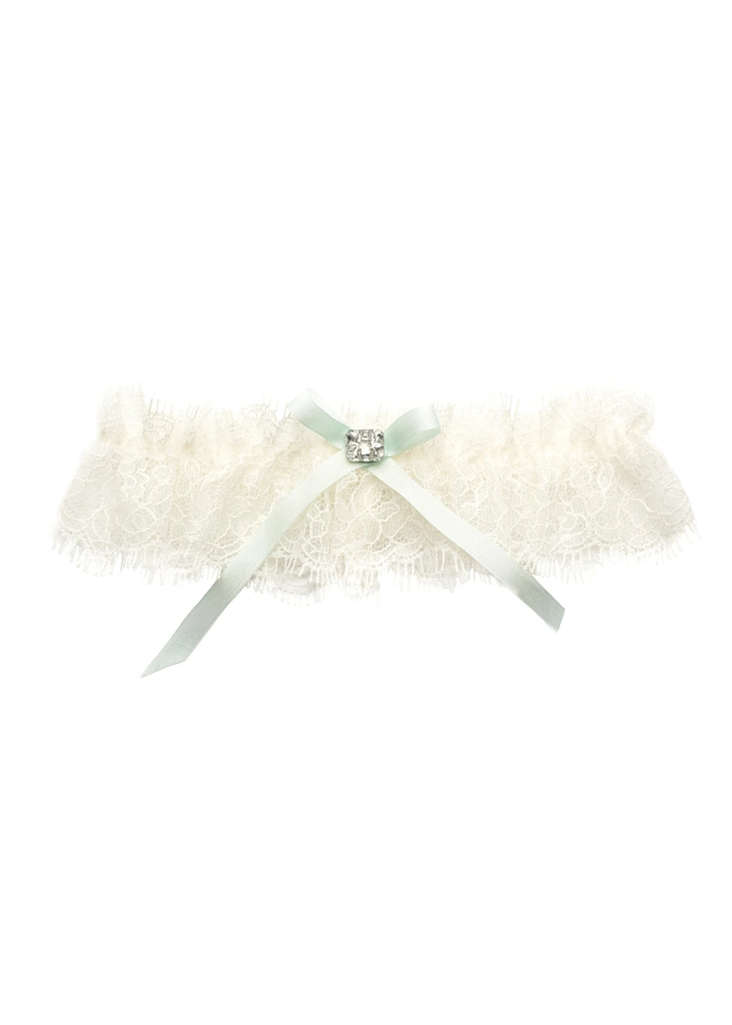 Exuding the Parisienne Chic, the delicate French Chantilly lace garter is beautifully embellished with a duck-egg blue silk ribbon with a sparkly vintage crystal button. Handmade in Australia with the finest silks, delicate laces and trimmings.