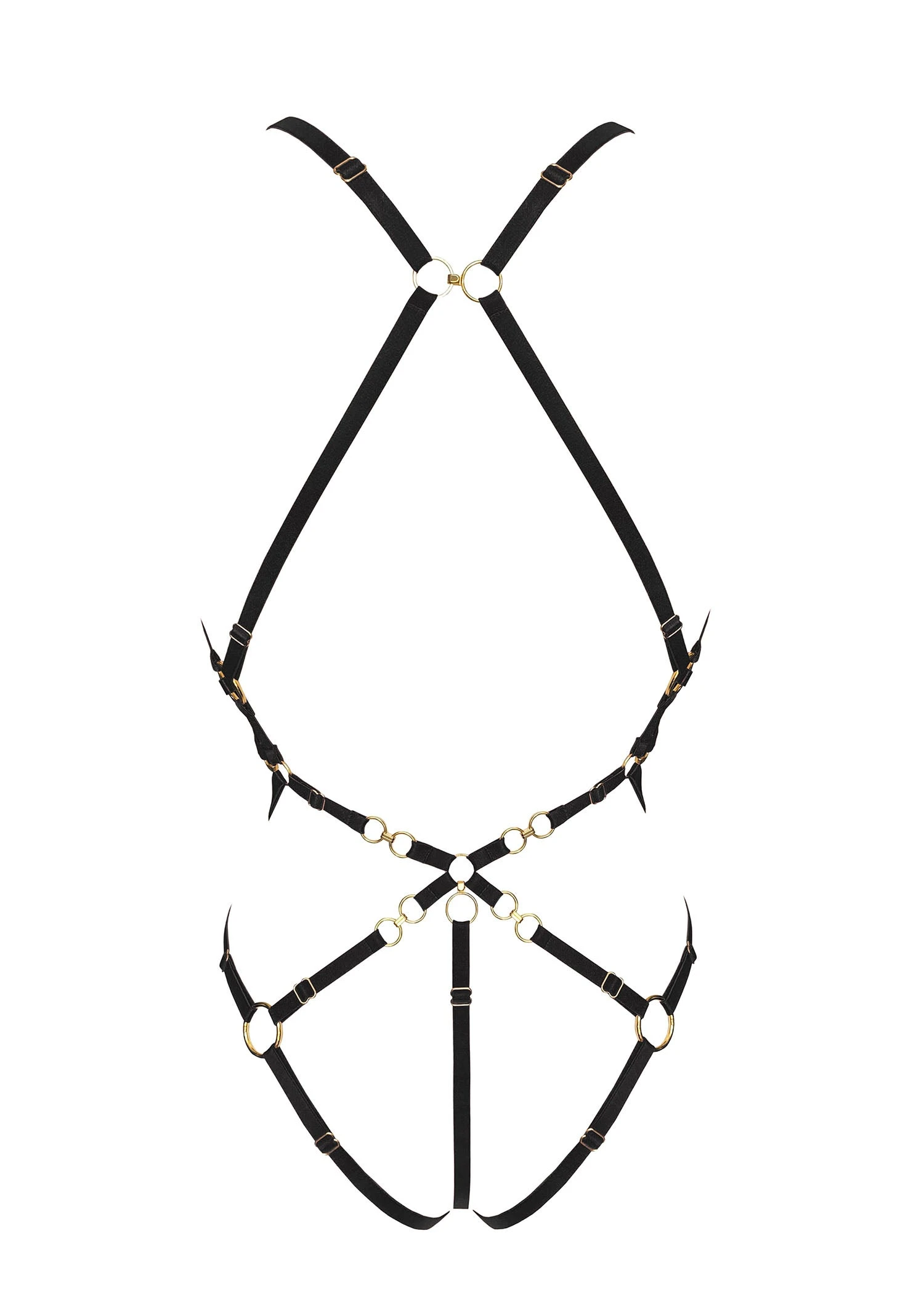 Captivate in the Kleio Multi-Style Harness Body. Displaying our new 24k gold plated chain-link component, this versatile piece features a detachable mesh body which is secured to rings on the harness via 24k gold plated ring hooks. Wear the elastic harness solo or with the accompanying mesh body panel. Pair with nipplets for the ultimate bondage look.