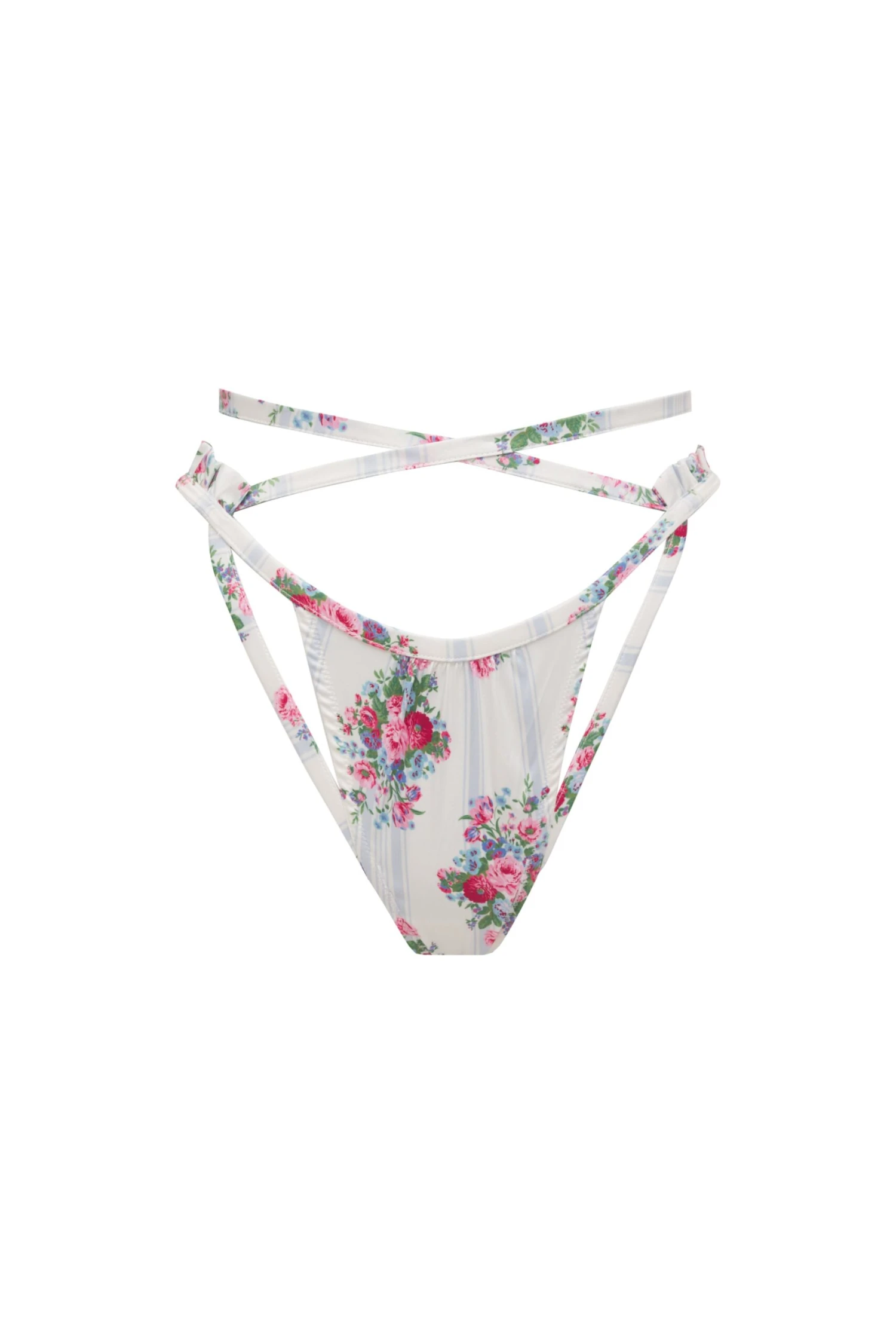 We’re smitten with this vintage-inspired, Victorian-floral print. As seen on a strappy, high-waist thong with ruffled details at the side and a crossover waistband. Perfect with the matching bra.