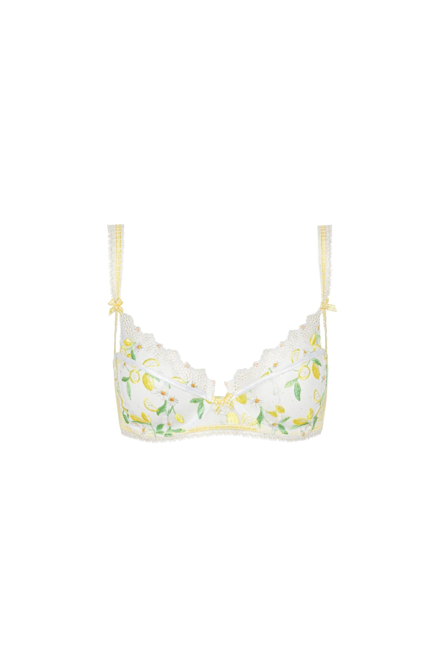 When life gives you lemons…squeeze them into your top drawer. Citrus fruits mix with daises for a fresh twist on embroidery. Featured on an extra sweet demi bra combining scalloped eyelet lace, gingham chiffon, subtle cutouts, and bow details.
