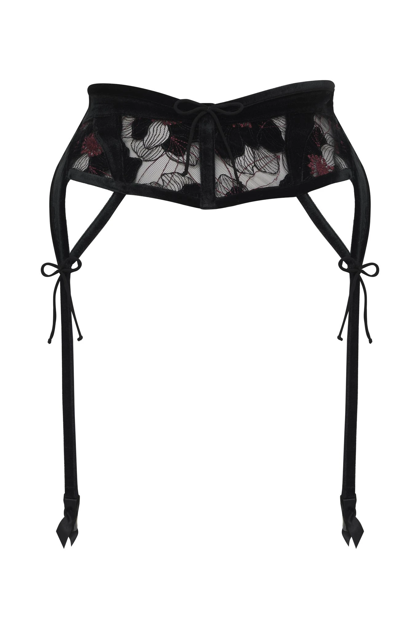 It doesn’t get more seductive than the combination of black lace and velvet. As seen on an embroidered garter belt skinny tie details.