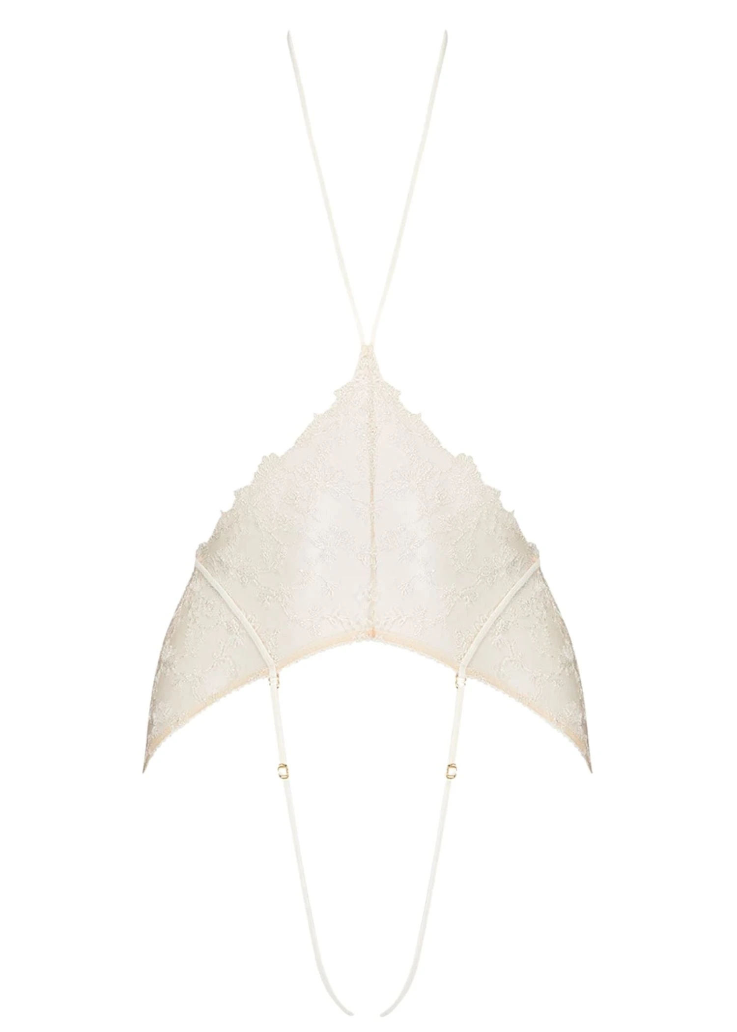 Feel the romantic tulle and floral Swiss embroidery soft across your skin. No angle is forgotten, this harness brief emphasizes your body from every side.