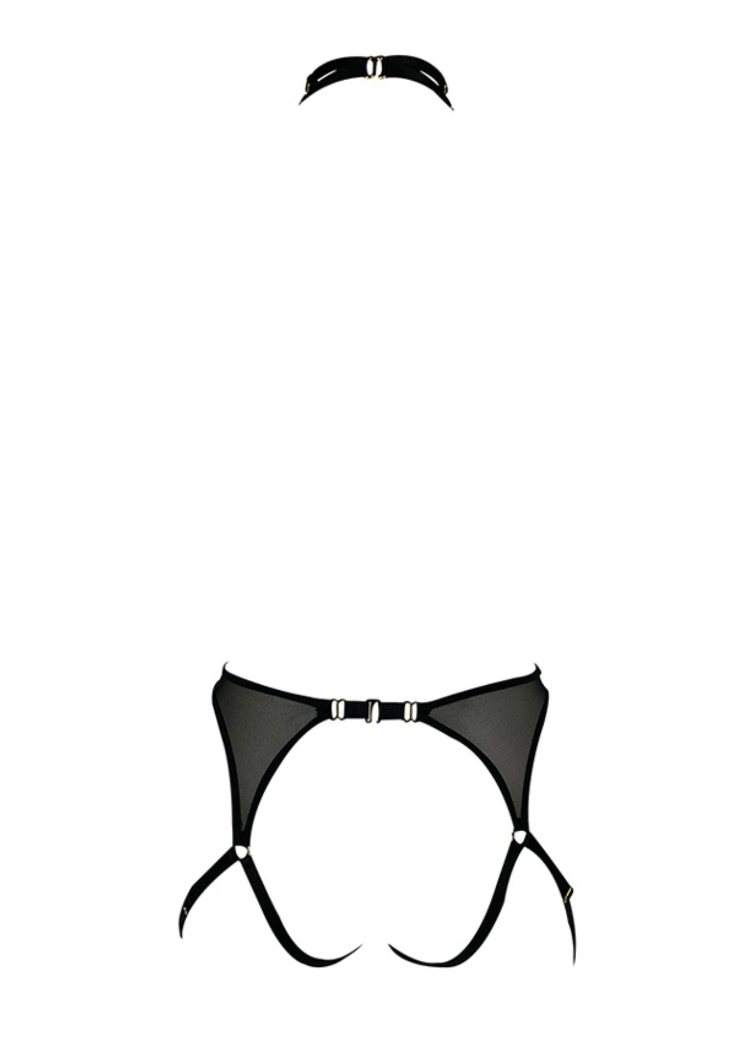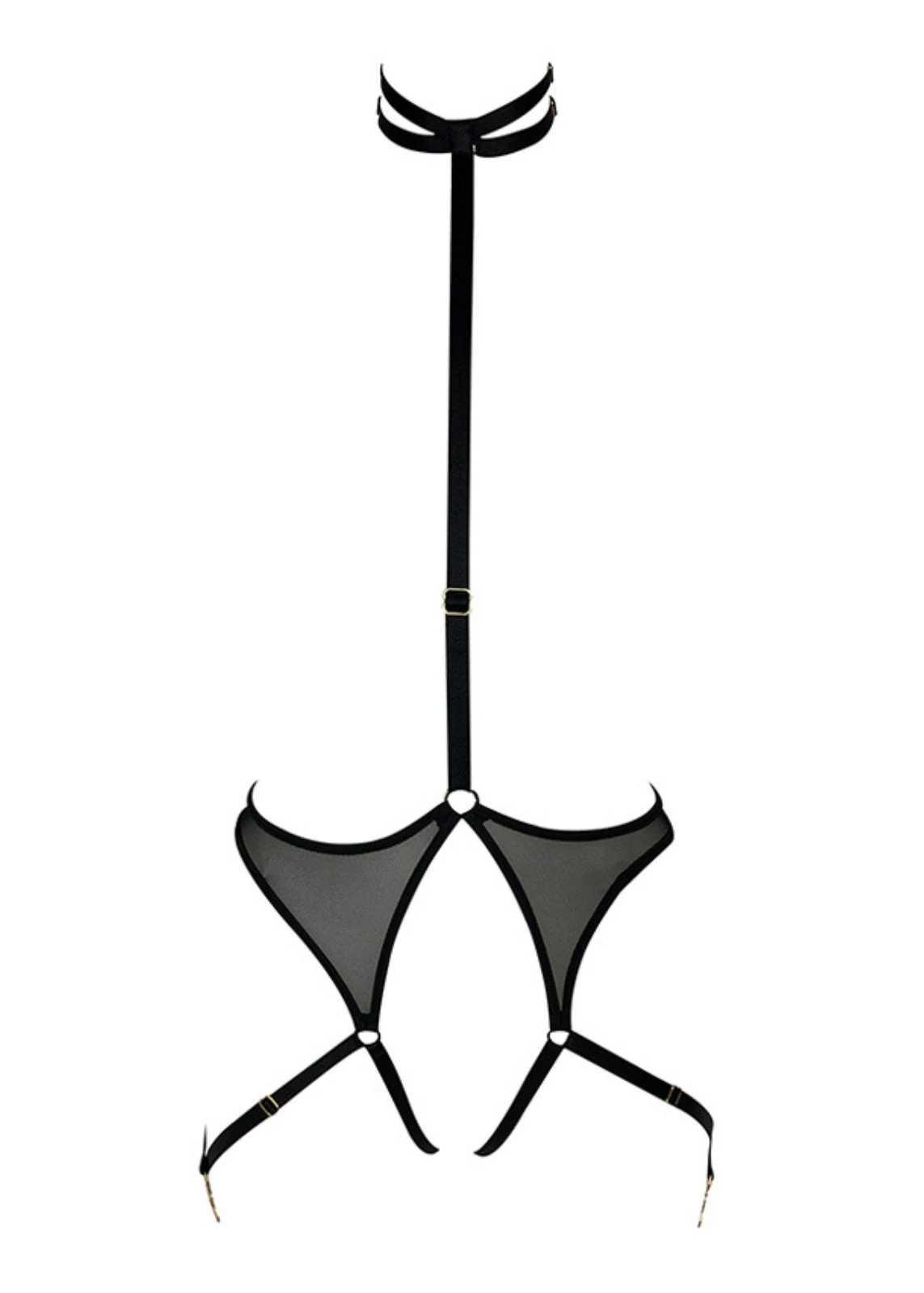 This contemporary take on bondage creates a harness suspenders of soft mesh and straps, featuring a slim collar and an adjustable central strap to accentuate the chests.