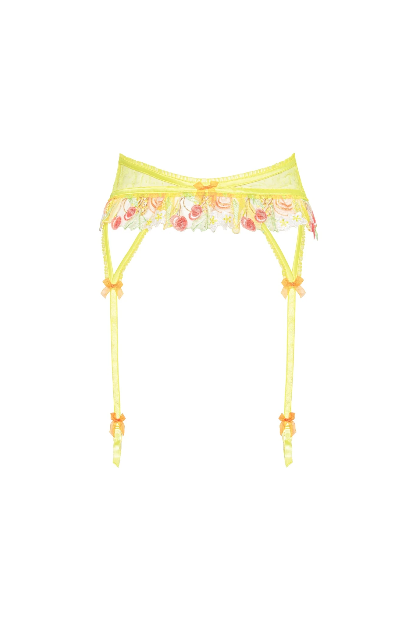 The prettiest way to squeeze more fruit into your day? A cheerful garter belt embroidered with a colorful arrangement of cherries, lemons, pineapples, and lemons on its ruffled waist. Sheer dotted mesh panels enhance the sweetness. Pair with the matching bra and panty.