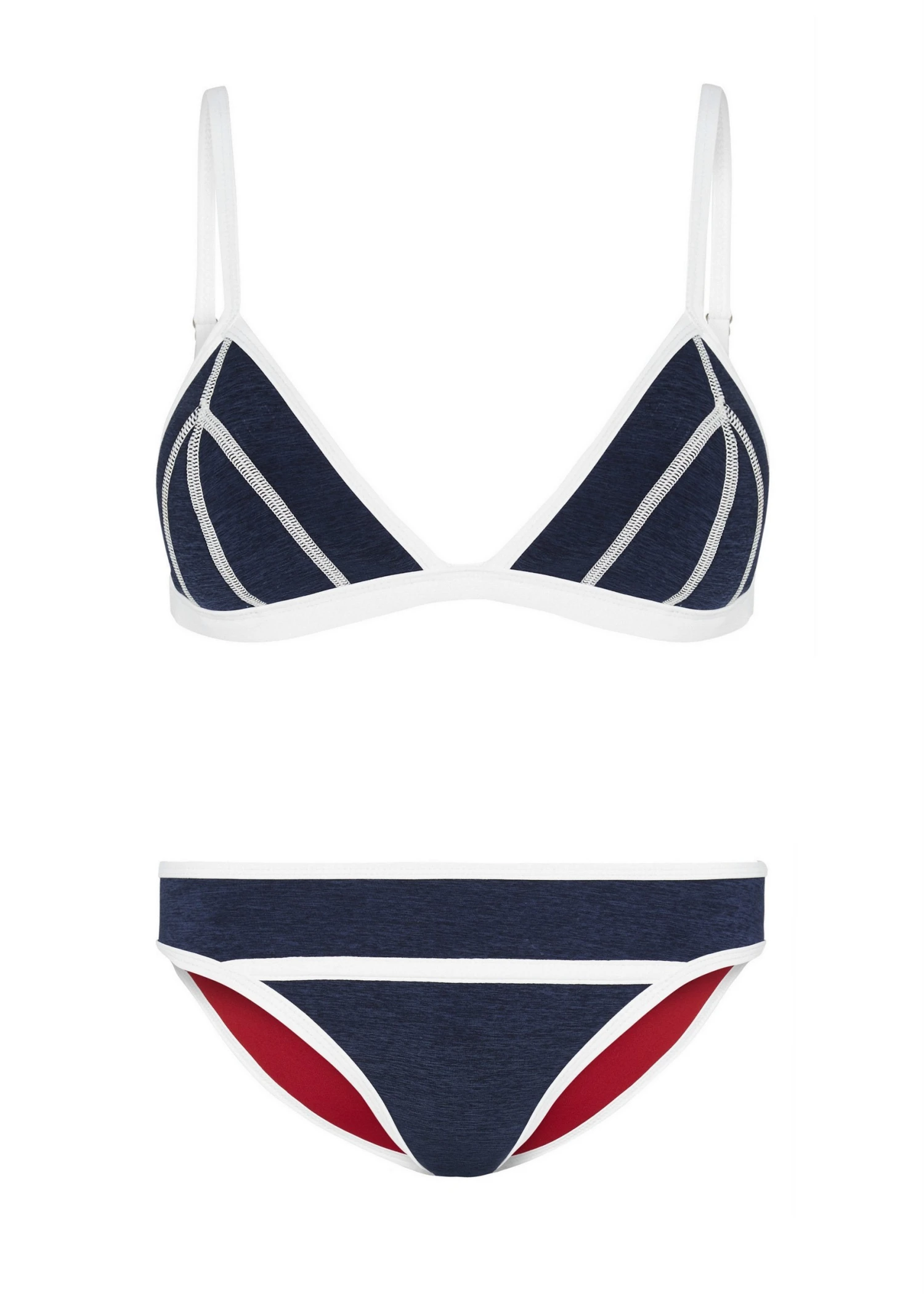 Defined by textured marl bonded jersey with contrasting white binding, the Monte Carlo Sim Tri Bikini Top and Waist Band Pant Swimwear are designed to flatter with the V-neck which dips all the way to the waistband and the bikini bottom gently hovering over your hips.