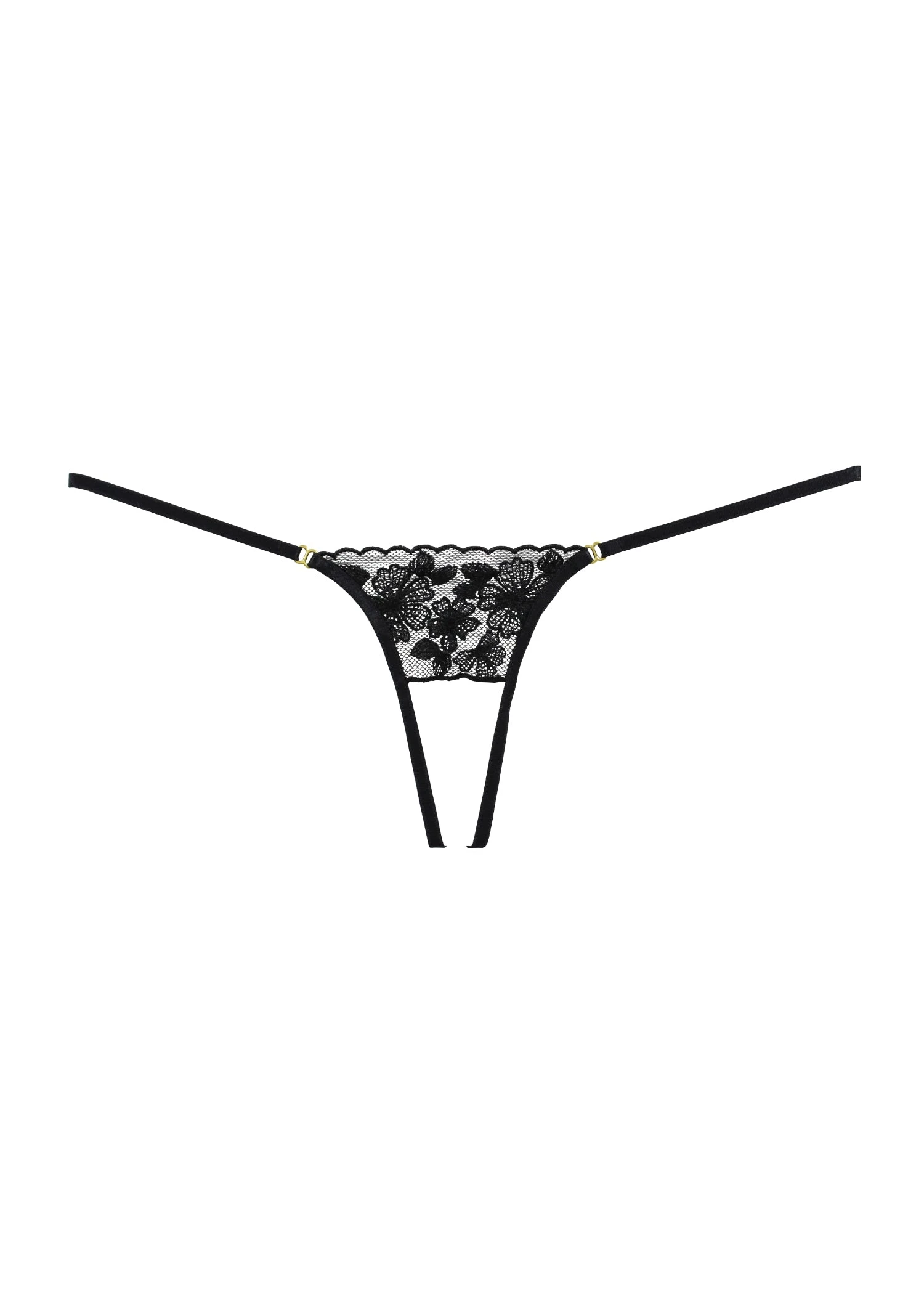 Be daring and let your inner vixen come out with the Mystic Pansy Crotchless Thong. This stylish lingerie combines black lace and golden hoops to create a bold and captivating look. Perfect for nights of passion, this provocative piece of lingerie will surely tantalize and tease your partner.Â