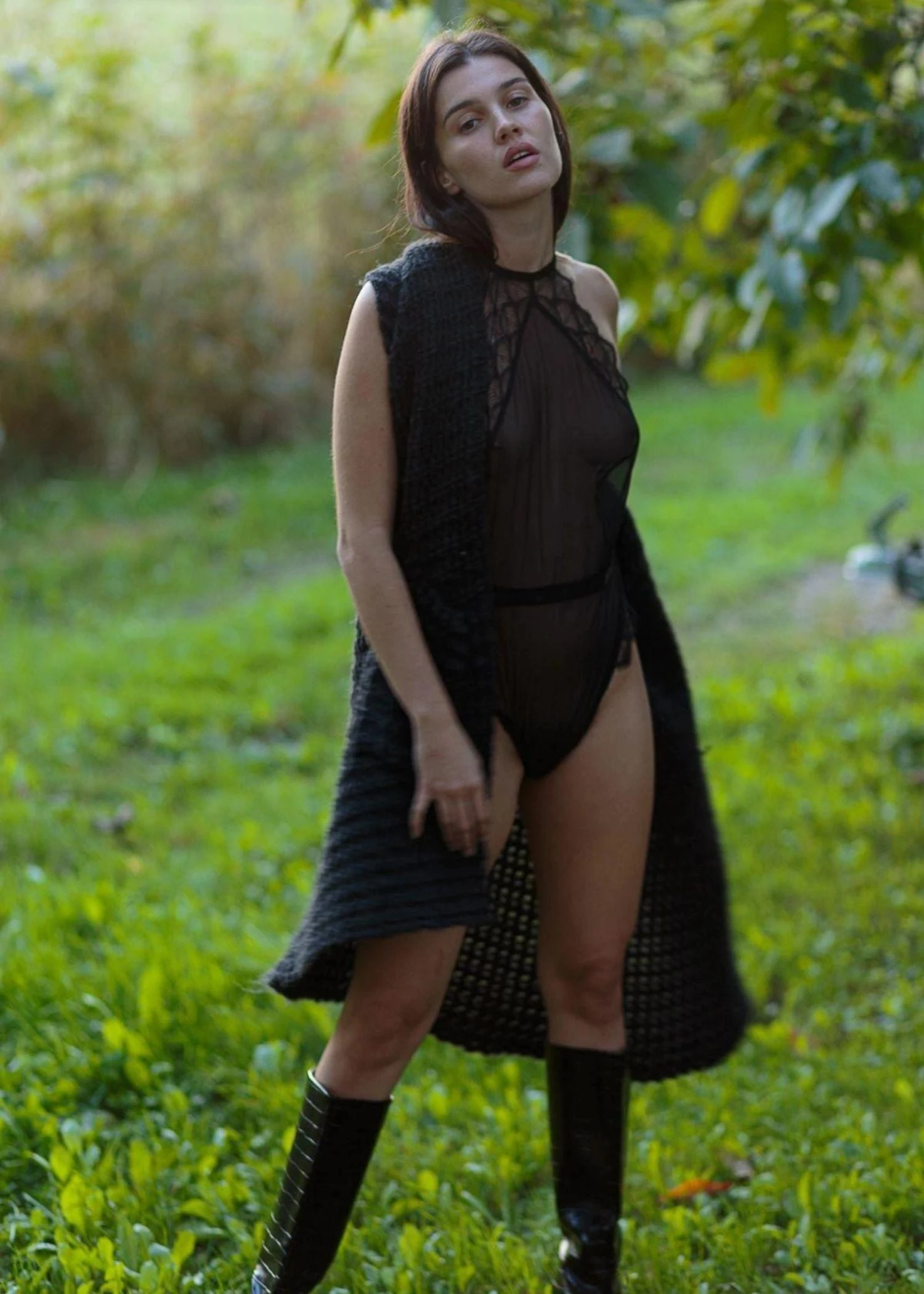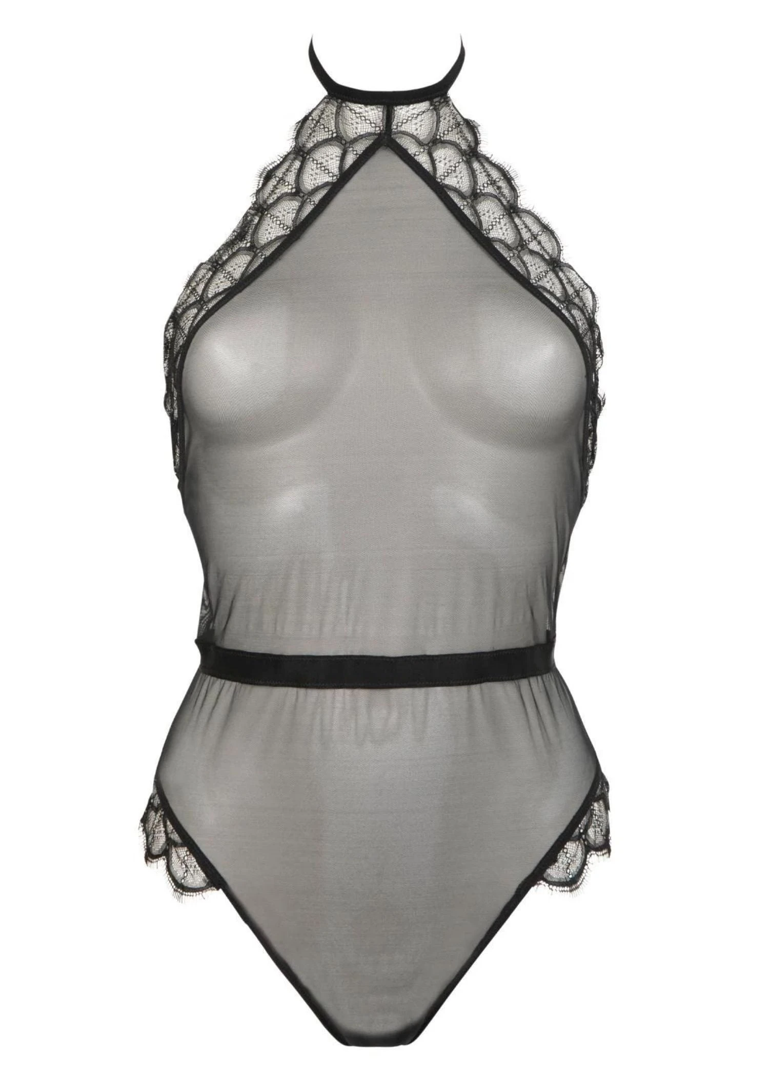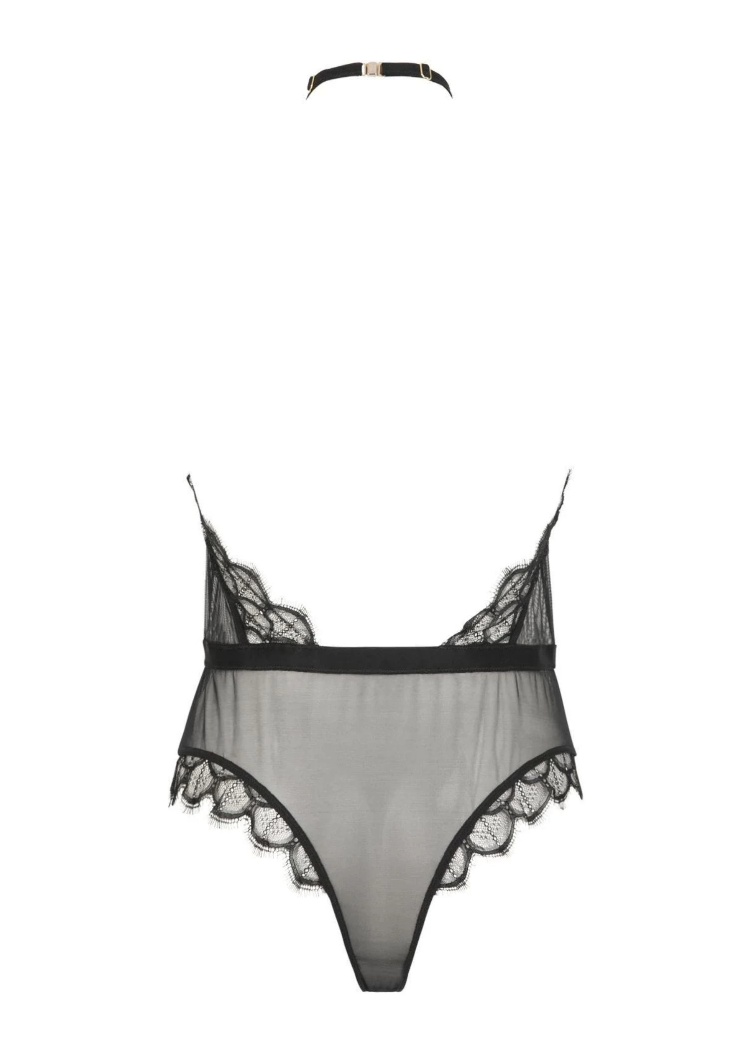A modern and seductive piece. This transparent black backless bodysuit with delicate lace trimmings and soft waist belt enhances your silhouettes, while the golden clasp and g-string back offers an elegant evening look.